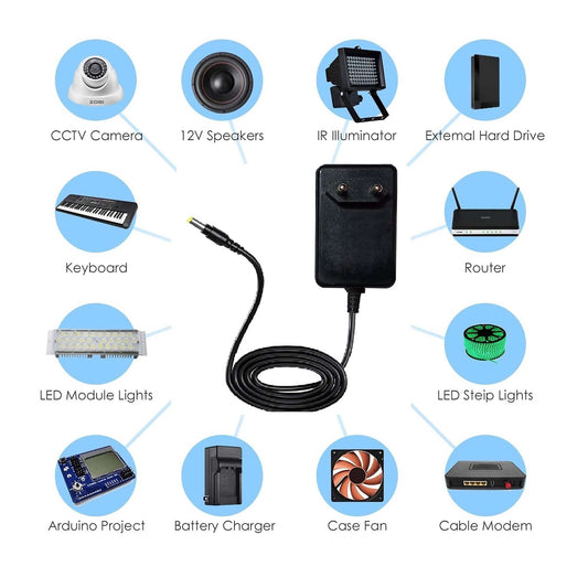 12V 2A DC Power Supply Adapter Powers Supply, SMPS for LCD Monitor, TV, LED Strip, CCTV, 12 Volt 2 A Power Adapter, AC Input 100-240V Dc Output 12 Volt 2A - 2.5mm Jack - Black - RS5460