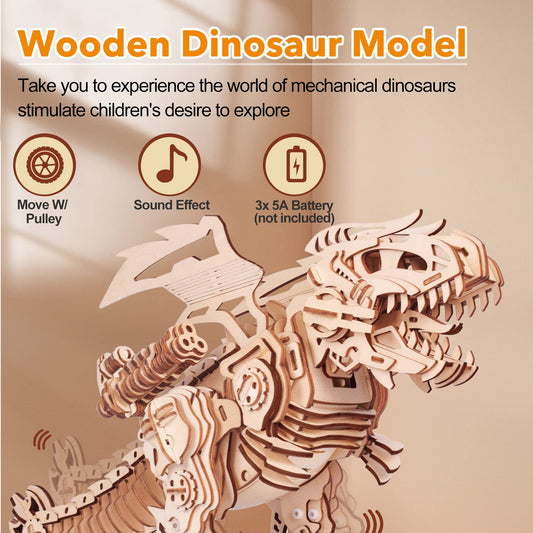 DIY T-Rex Dinosaur STEM Kit 3D Wooden Puzzles T-Rex Dinosaur Model Kit can Walk and Roar, Mechanical Dinosaur Toys for Boys Kids Ages 8-10-12-14, 3-D Puzzles Building Kit - RS6167