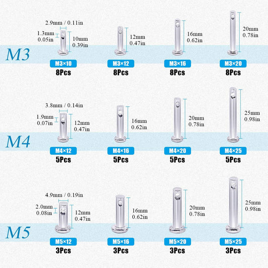 Clevis Pins Assortment Kit 64Pcs 12 Sizes 304 Stainless Steel Clevis Pins Assortment Kit M3 M4 M5 Flat Head Single Hole T-Shape Round Pin Fastener Pins - RS2793