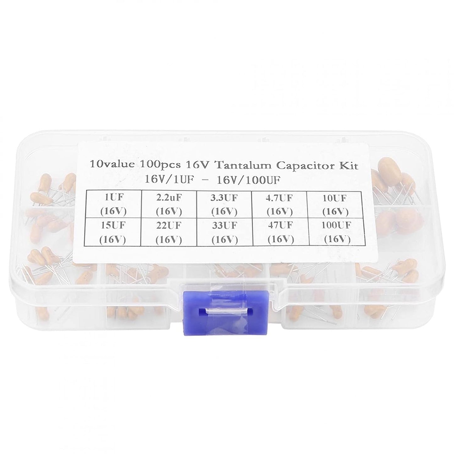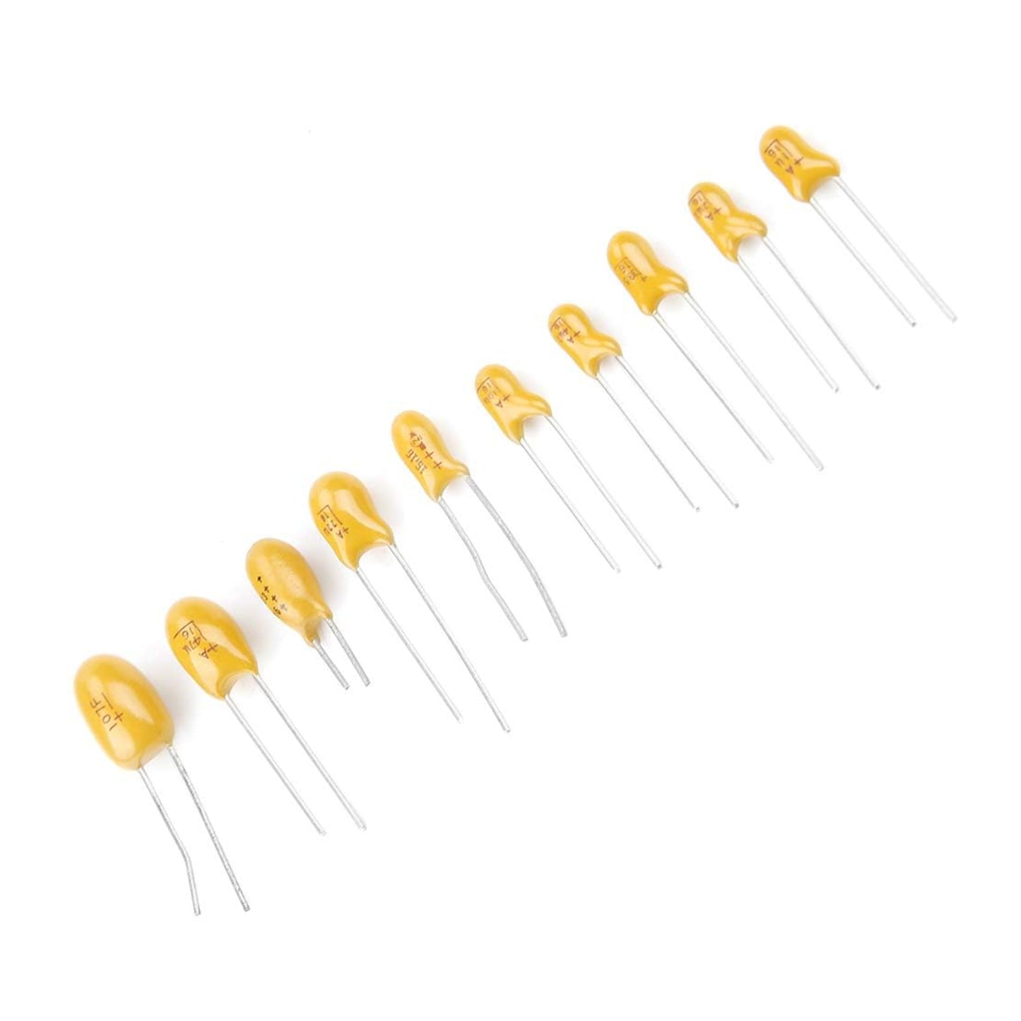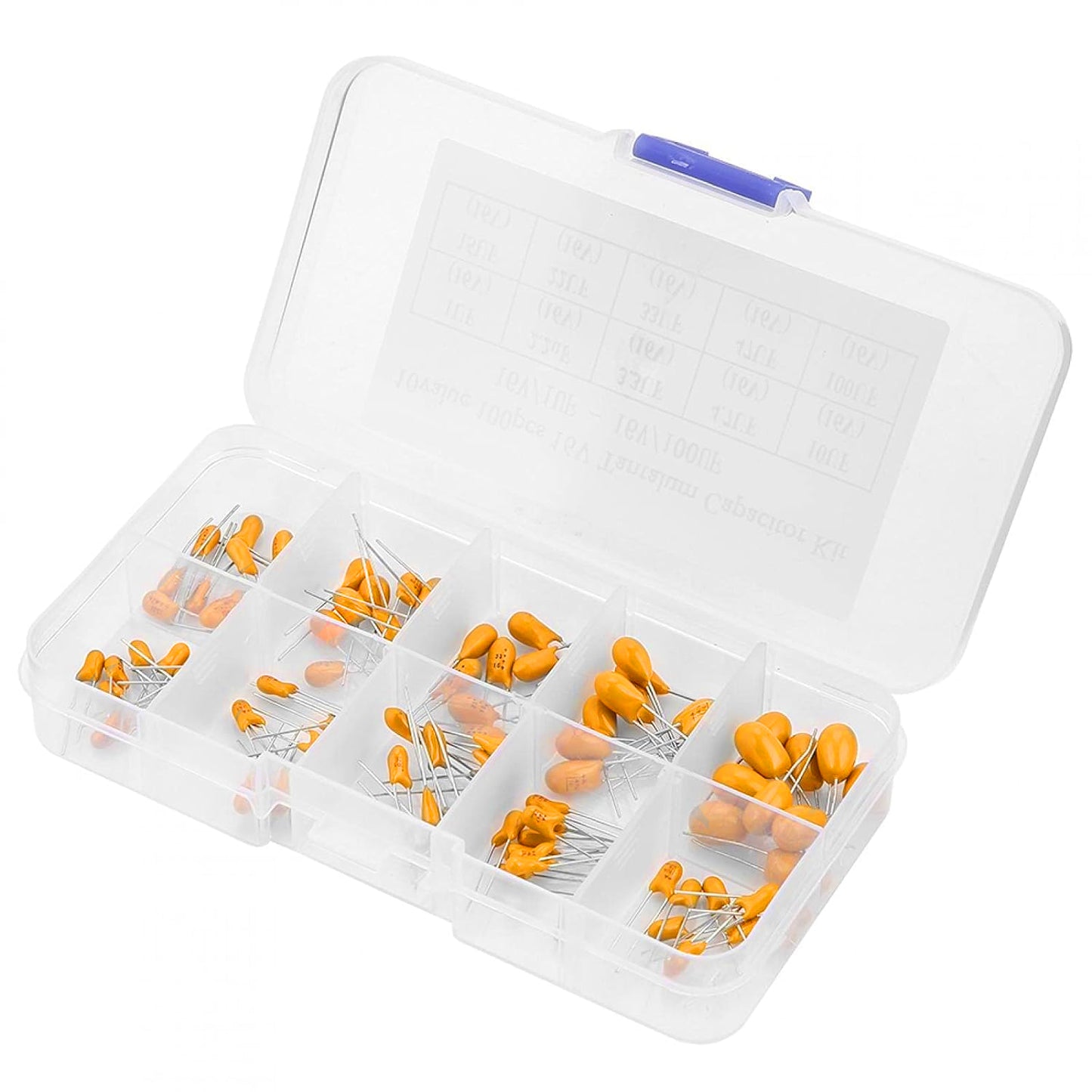 These tantalum capacitors are compact and offer high-capacitance capacitors. There are a total of 100 pieces of capacitors in 10 values in this set which will meet your basic needs. All capacitors are well-packed and assorted in a plastic box for convenient storage. There is a label on box so you can easily identify which type of capacitors you need. This is a great assortment of capacitors for electronic professionals or enthusiasts.