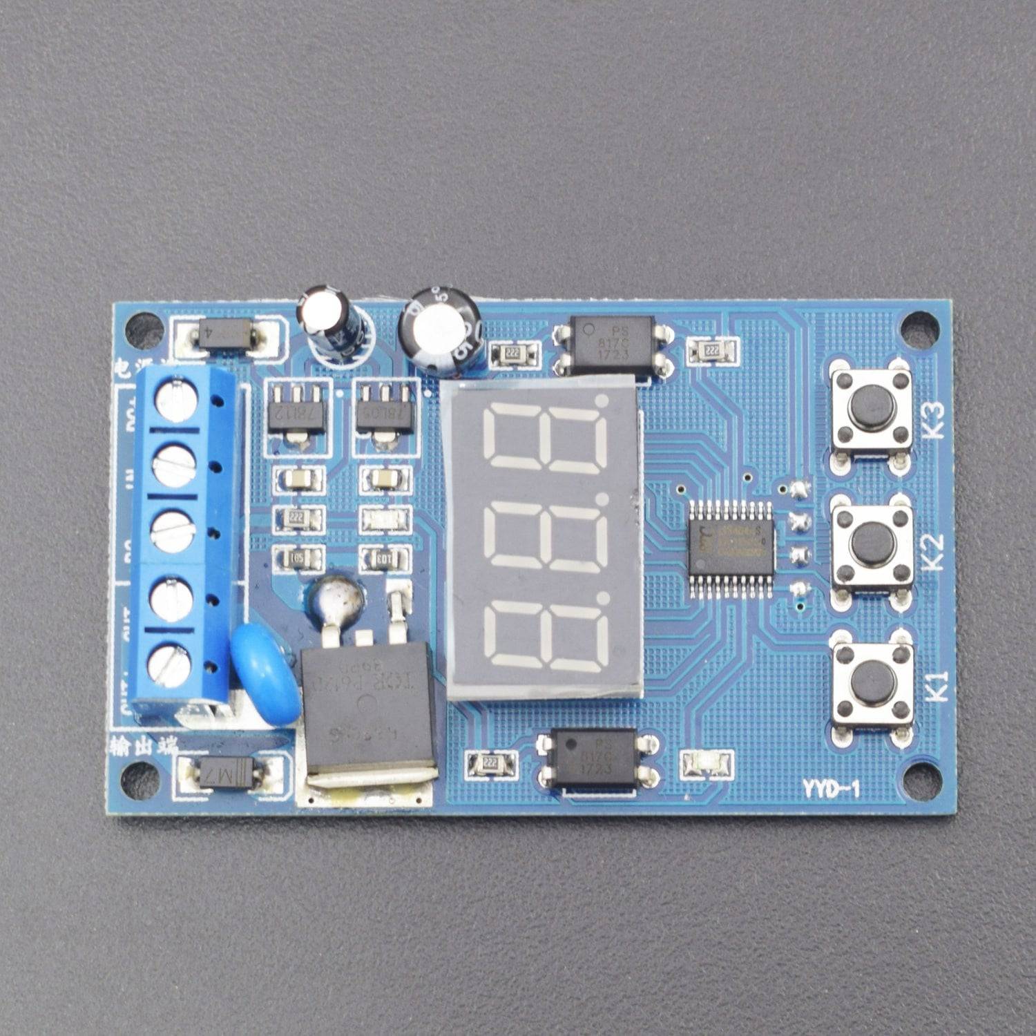 This is a 12/24V delay time switch module. It has 3 digits led display, intelligent control, time relay/delay function. And during the on-off process, will not produce any noise. The last setting parameters can be memorized after power off. It is basically applied to control motor, bulb, LED light string, mini pump, etc.