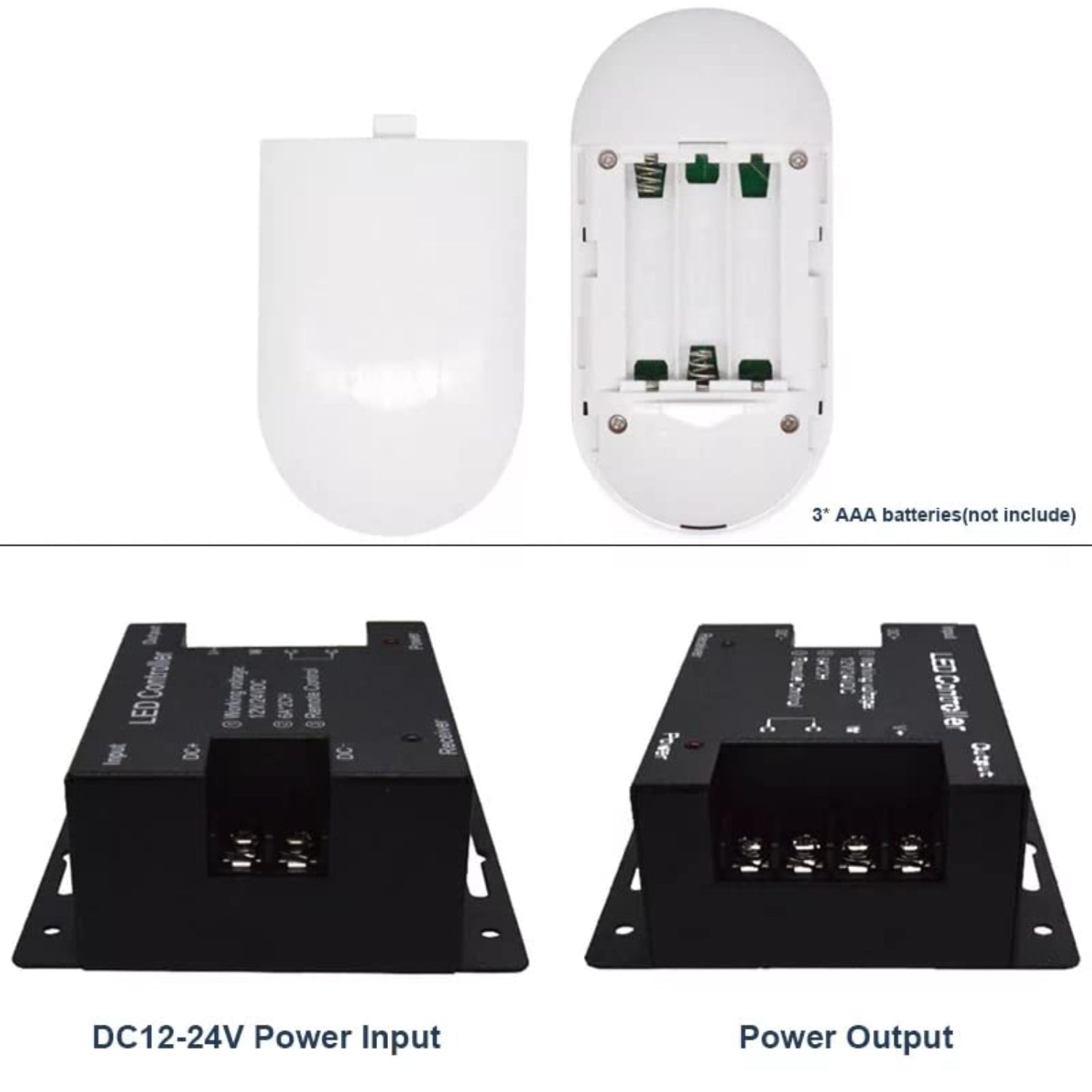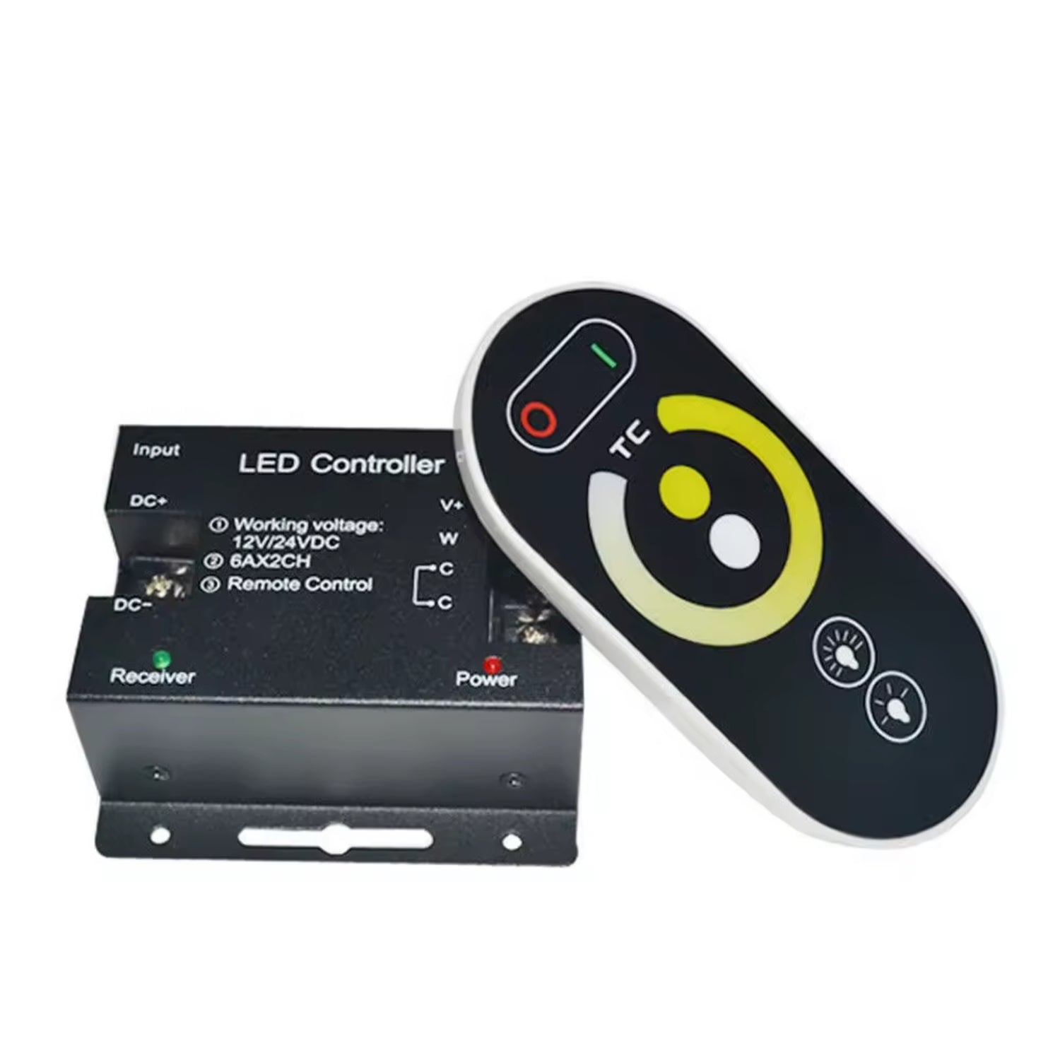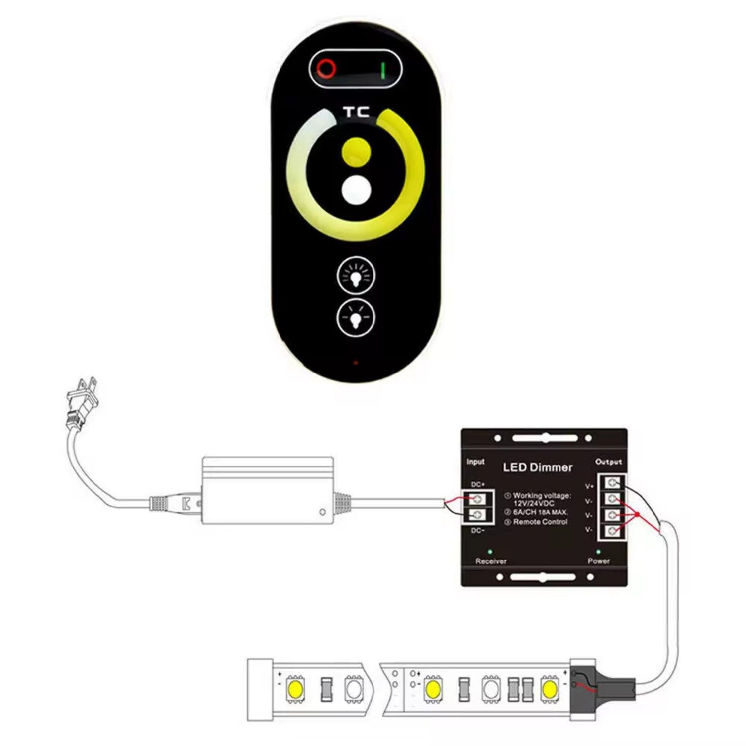6A each channel, total:12A (The touching ring is sensitive, the wheel is very intuitive and appears in the touch ring, users can choose the color they prefer from cold white to warm white.) 3x AAA Battery (Not included), This remote can touch a single point or touch continually to realize choosing the color. (Remote distance Max 20m in open area)