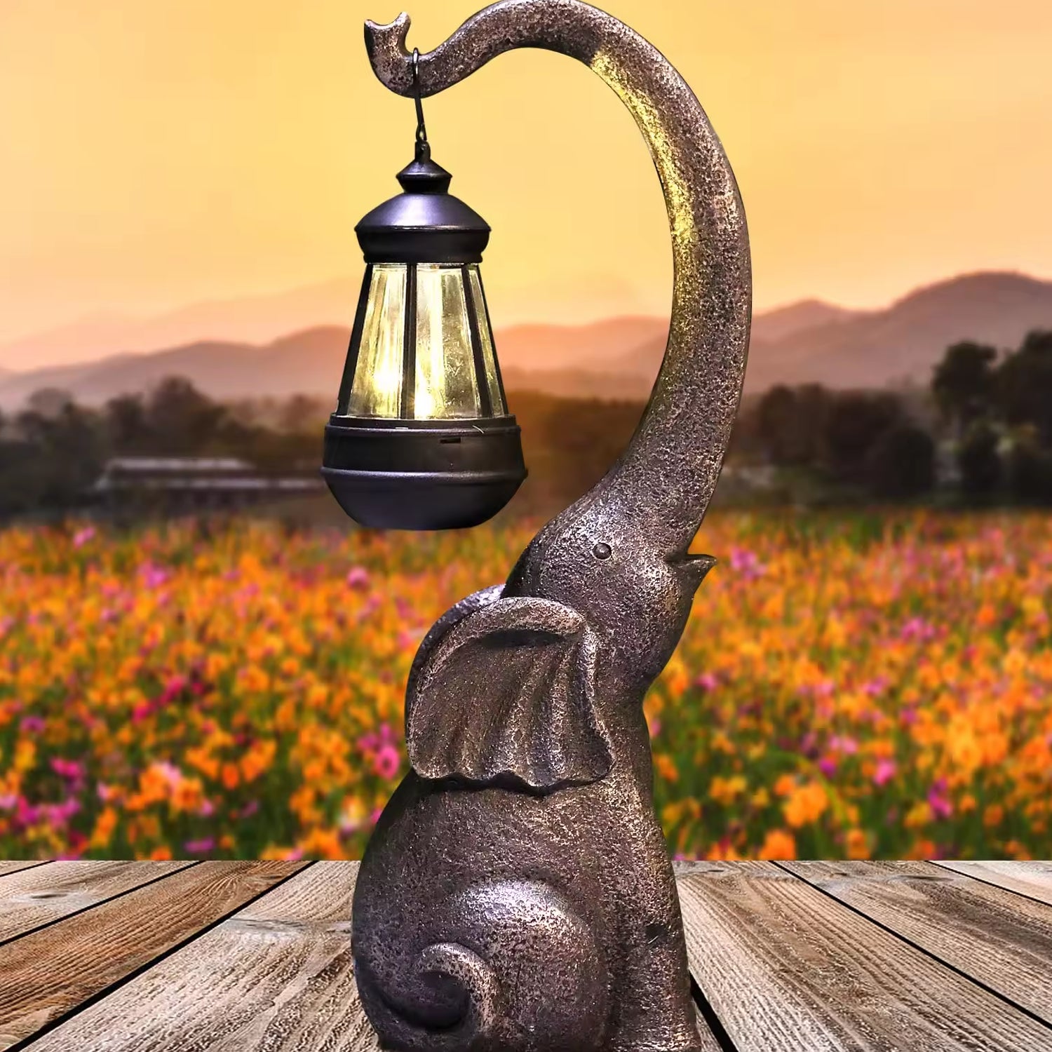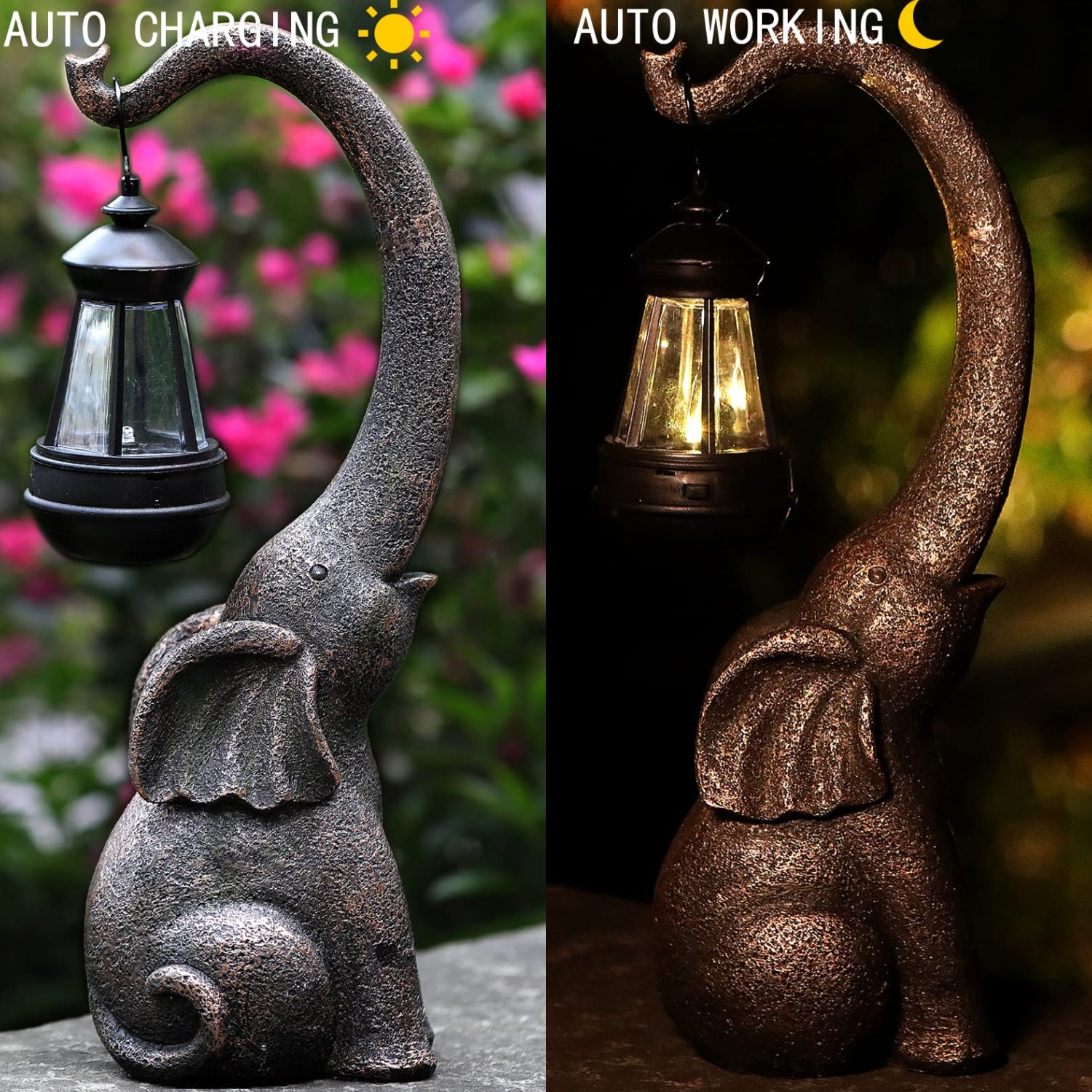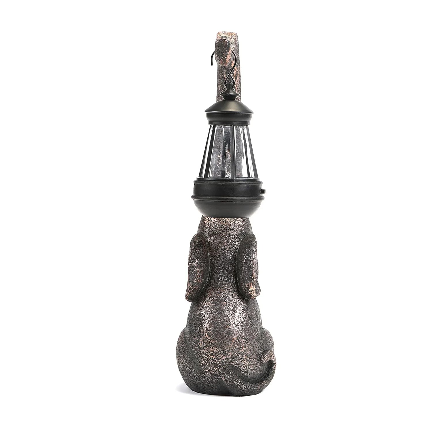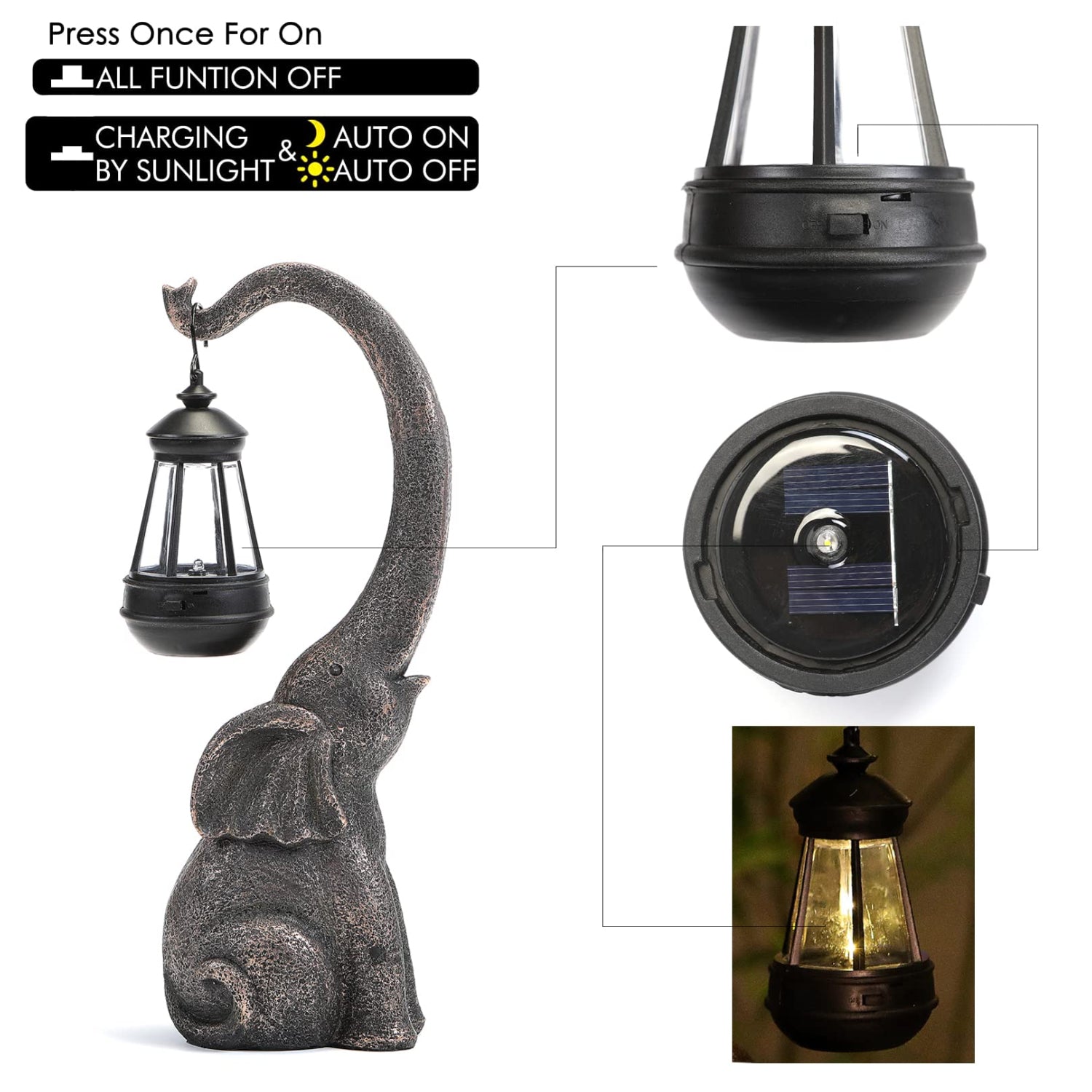 Elephant Sculpture Solar Light comes with a solar powered light for outdoor lighting. The automatic solar powered light has a solar panel that absorbs sun light during the day to convert sunlight into electricity to recharge the AA Ni-MH battery. Solar power lights automatically turn on at night and turn off at dawn.