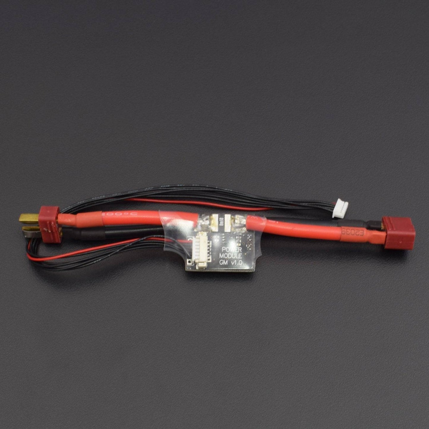 The APM 2.5 Power Module is a simple way of providing your APM 2.5 with clean power from a LiPo battery as well as current consumption and battery voltage measurements, all through a 6-pos cable. The onboard switching regulator outputs 5.3V and a maximum of 2.25A from up to a 4S LiPo battery. The Power Module comes completely assembled with Deans connectors, and wrapped in shrink tubing for protection.