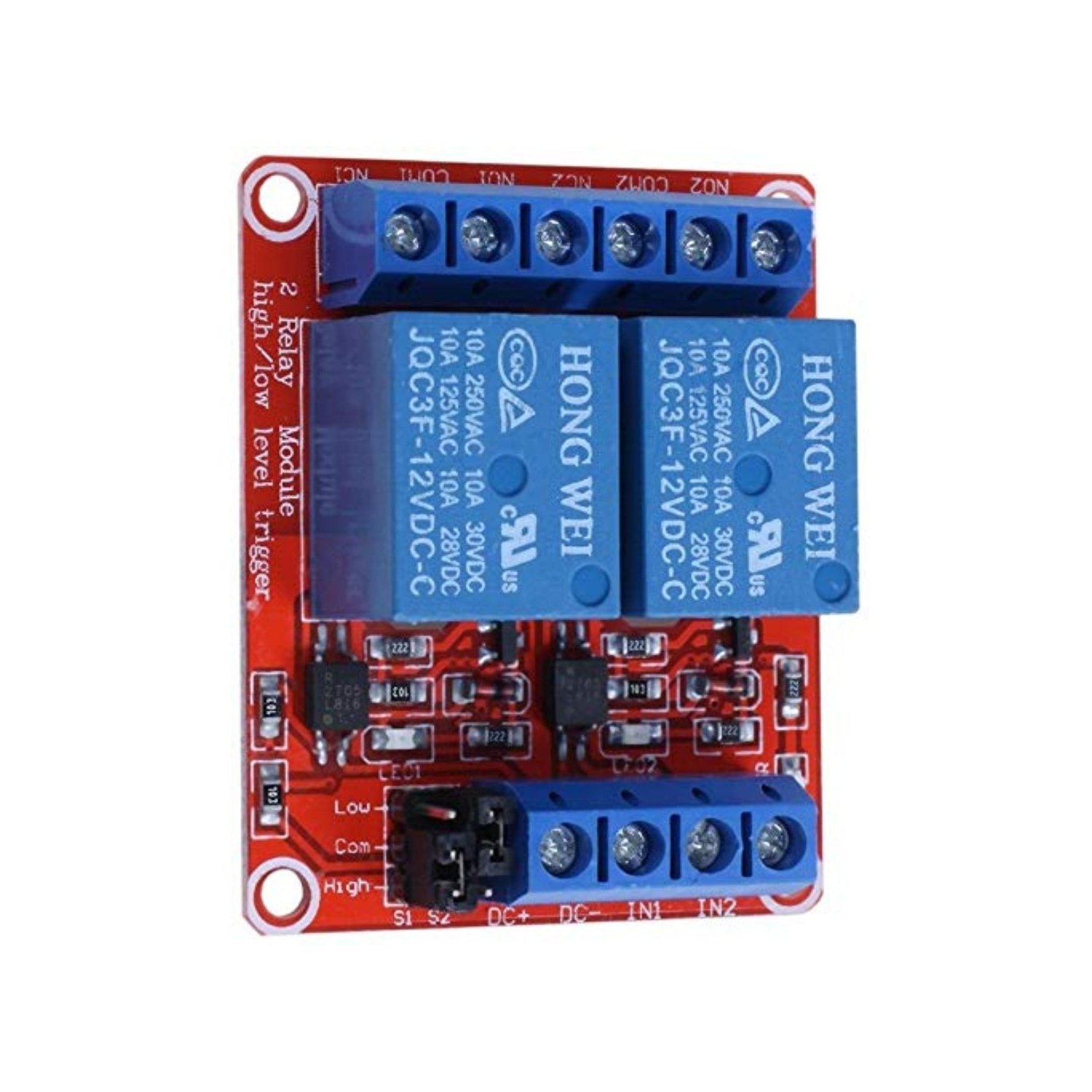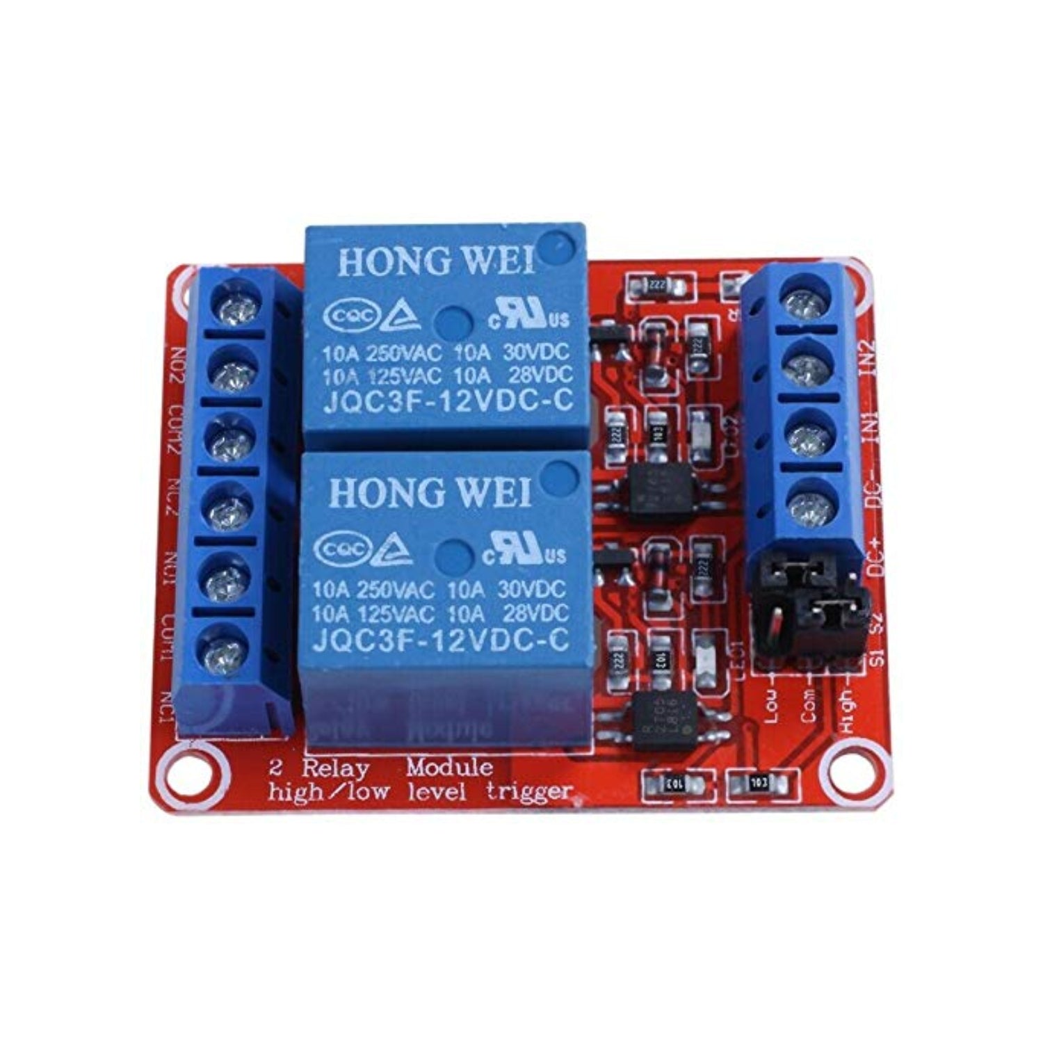 The 2 Channel Relay Module uses a genuine high-quality DC12V relay and SMD optoisolator supporting high/low-level trigger, widely applied to control various AC/DC appliances, and other devices with large currents.