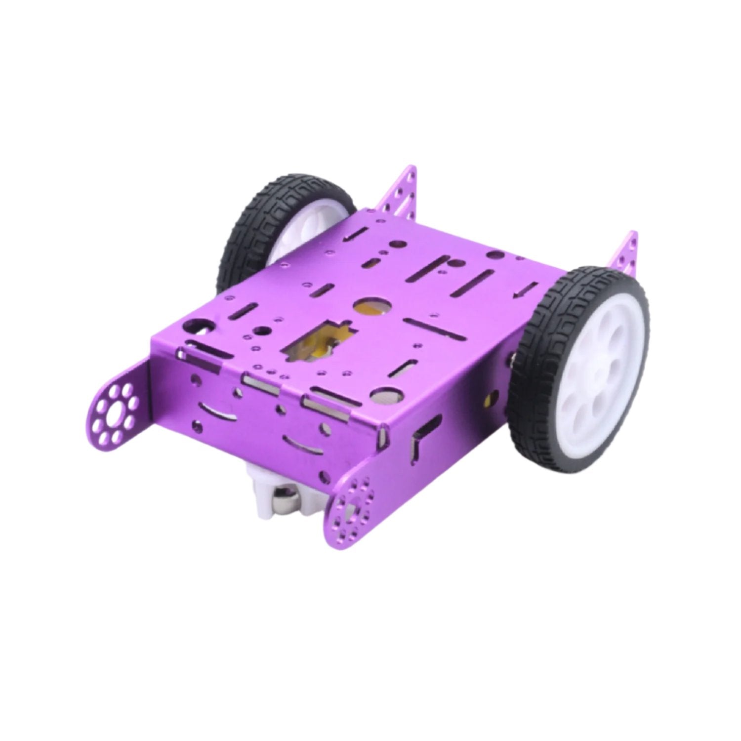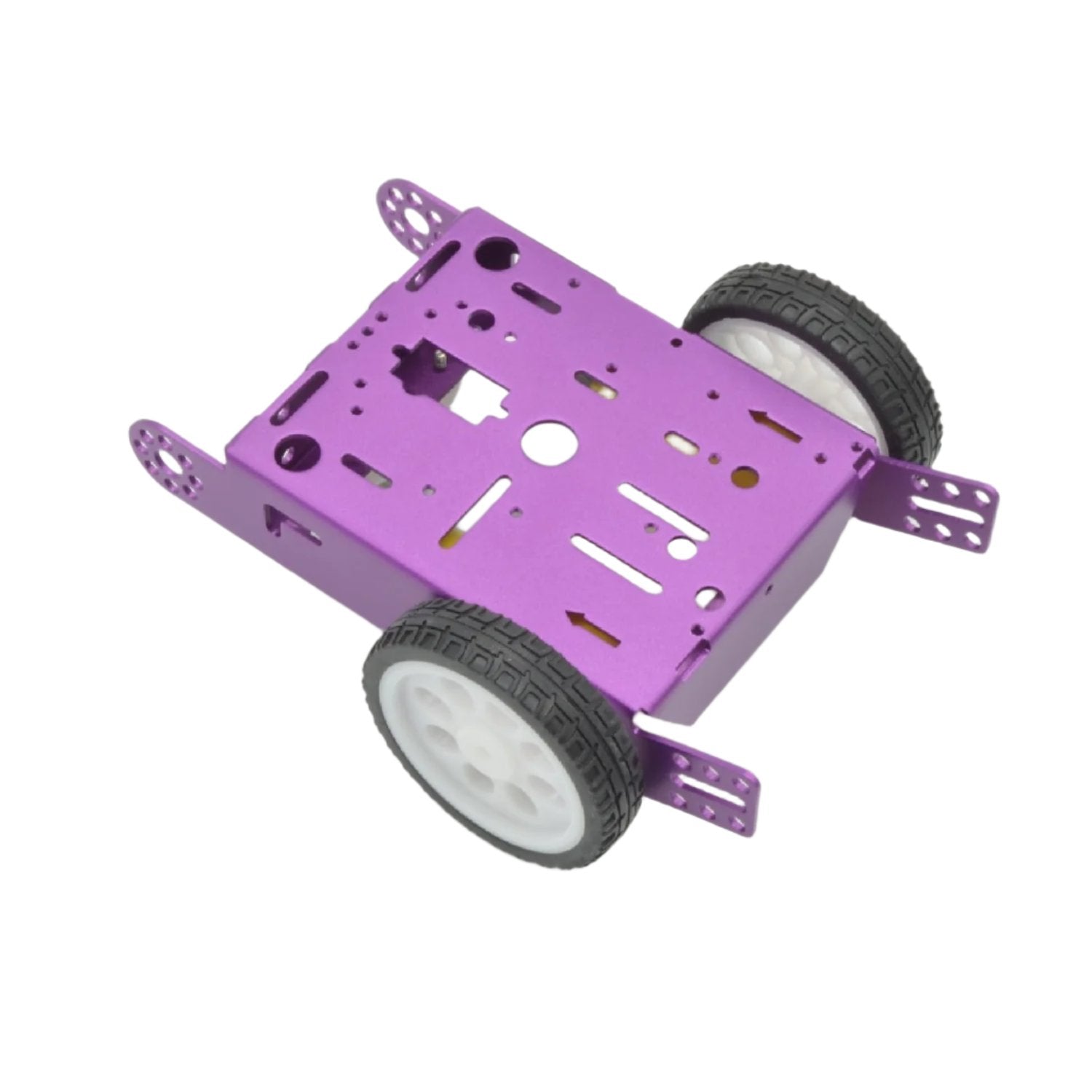 The DIY Robot Car Base Purple is anodized aluminum and features many pre-tapped mounting holes. The holes are tapped with an M3 thread, Mounting holes are compatible with most Arduino and other popular boards. The chassis itself may be purple or rose in color.