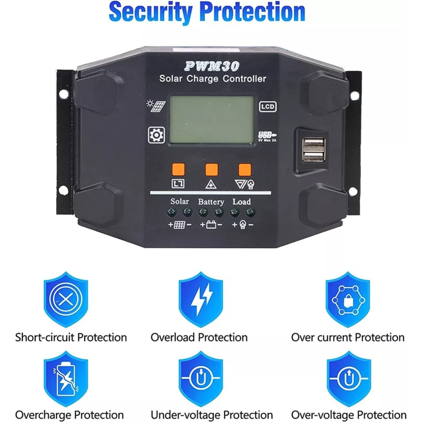 PWM30 Technology Ensures efficient charge transfer and optimal battery performance.30A Charging Capacity Handles significant solar power input. User-friendly interface of LCD and LED indicators for easy monitoring and control.