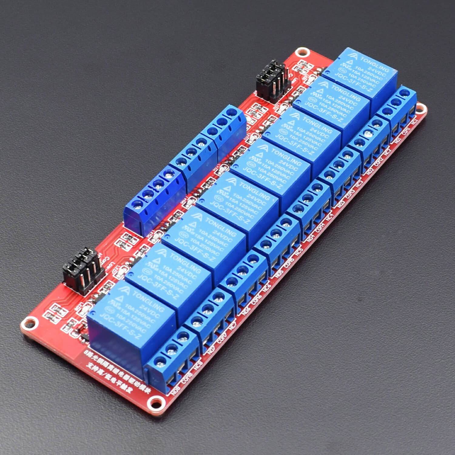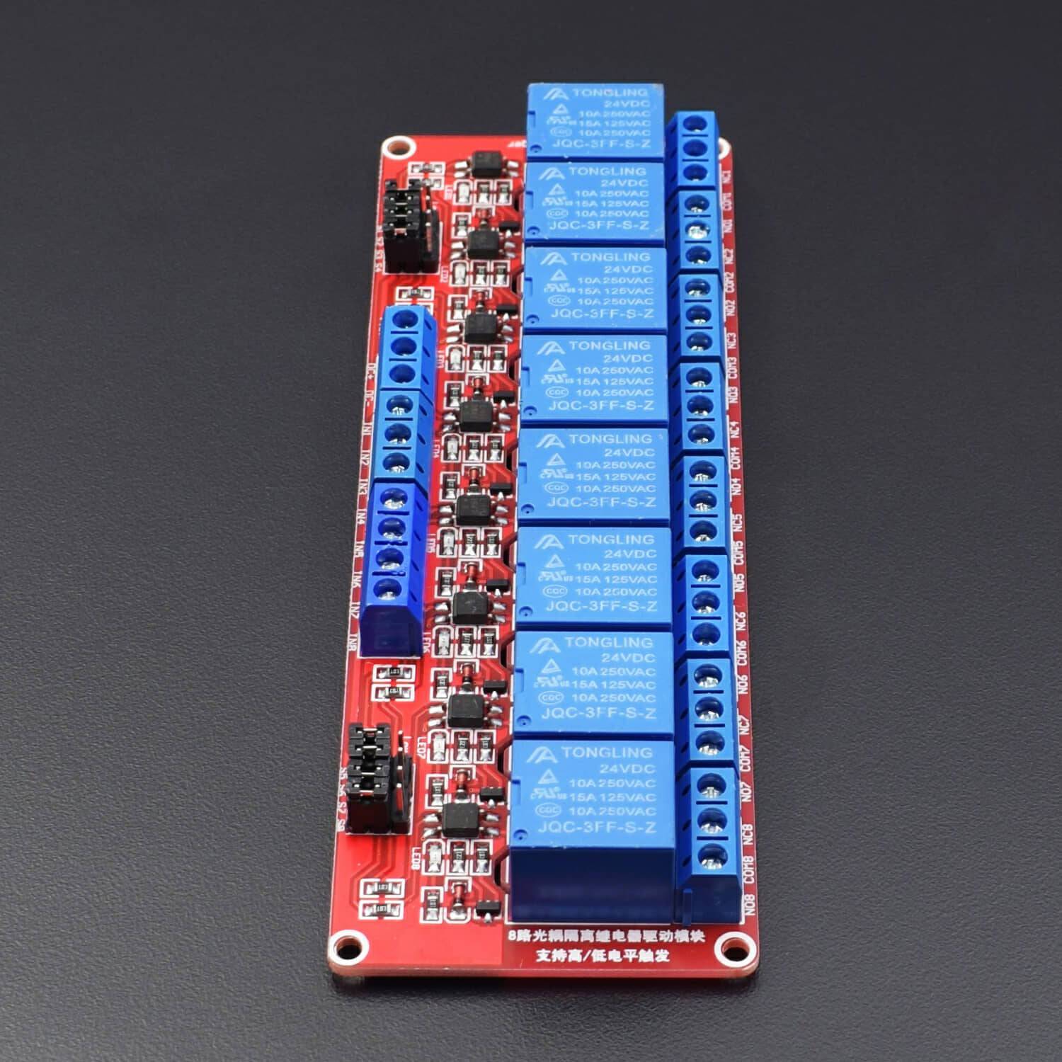 This is 8-Channel Relay Module High Low-Level Trigger with Optocoupler Isolation Load DC 24V / AC 250V 10A for PLC Automation. It has SMD optocoupler isolation, strong driving capability, stable performance; trigger current of 5mA. Each channel of the module can be set by a jumper cap high or low-level trigger.