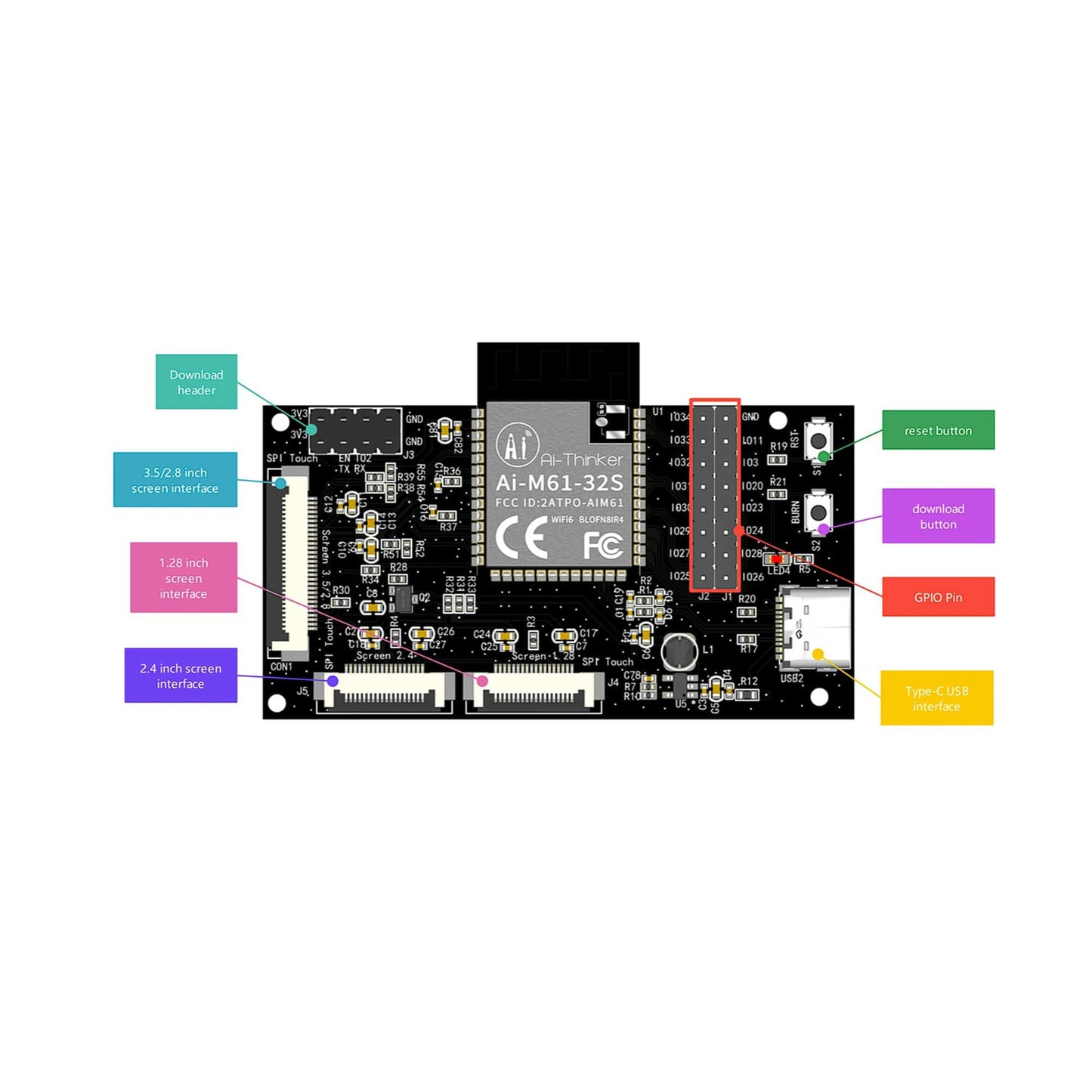 The Ai-M61-32S module equipped has rich peripheral interfaces, including DVP, MJPEG, Display, AudioCodec, USB2.0, SDU, Ethernet (EMAC), SD/MMC (SDH), SPI, UART, I2C, I2S, PWM, GPDAC, GPADC, ACOMP, GPIO, etc.