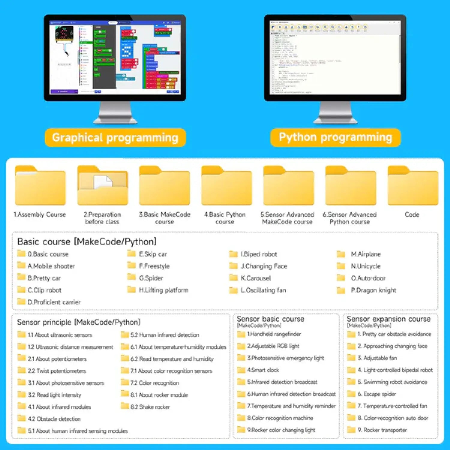 - 🔹 Supports graphical coding (MakeCode, Scratch) and Python