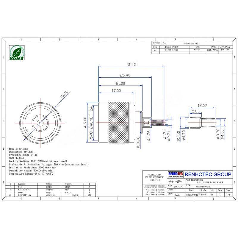 - N Connector,Male/Plug,Straight/180,Crimp Type,Coaxial Connector;