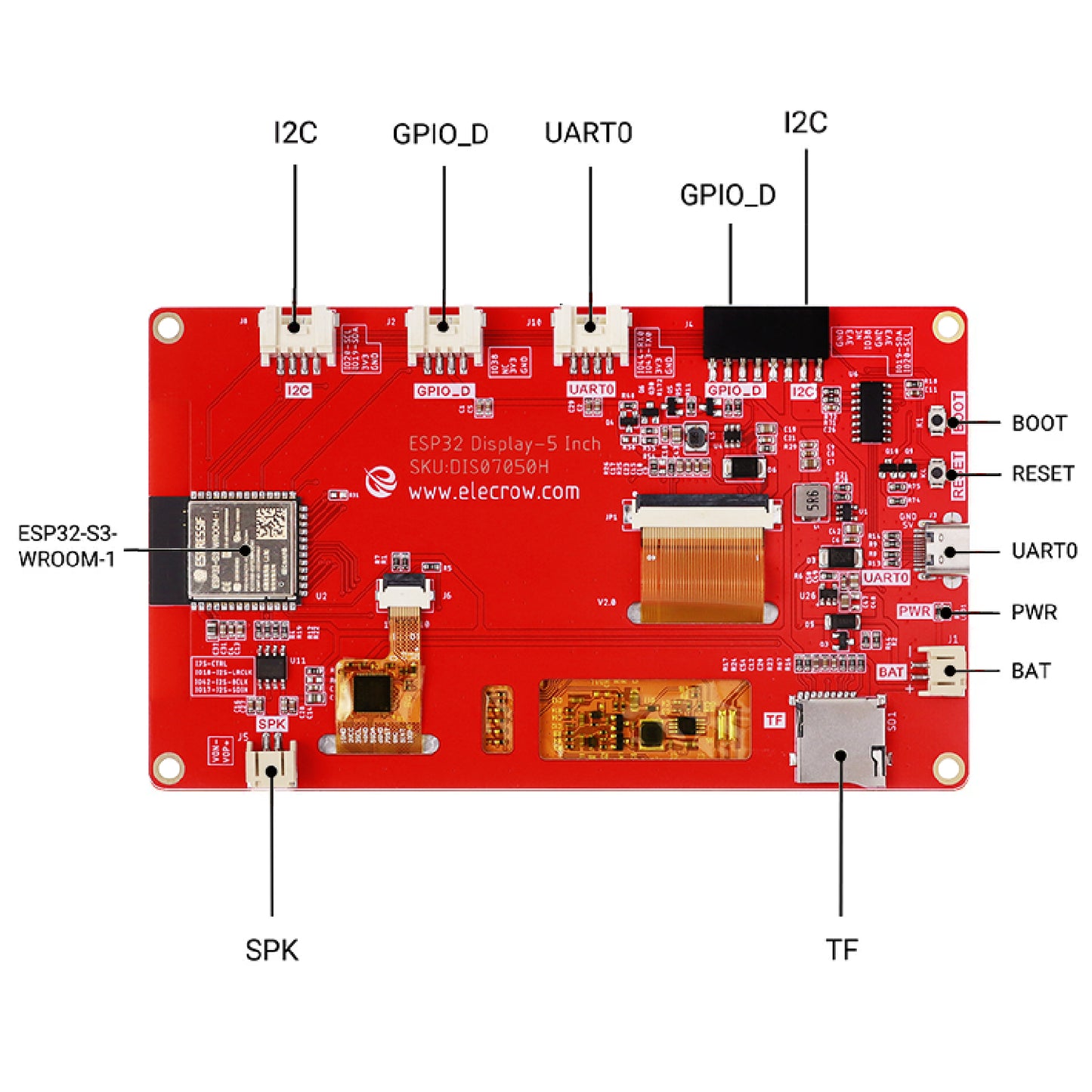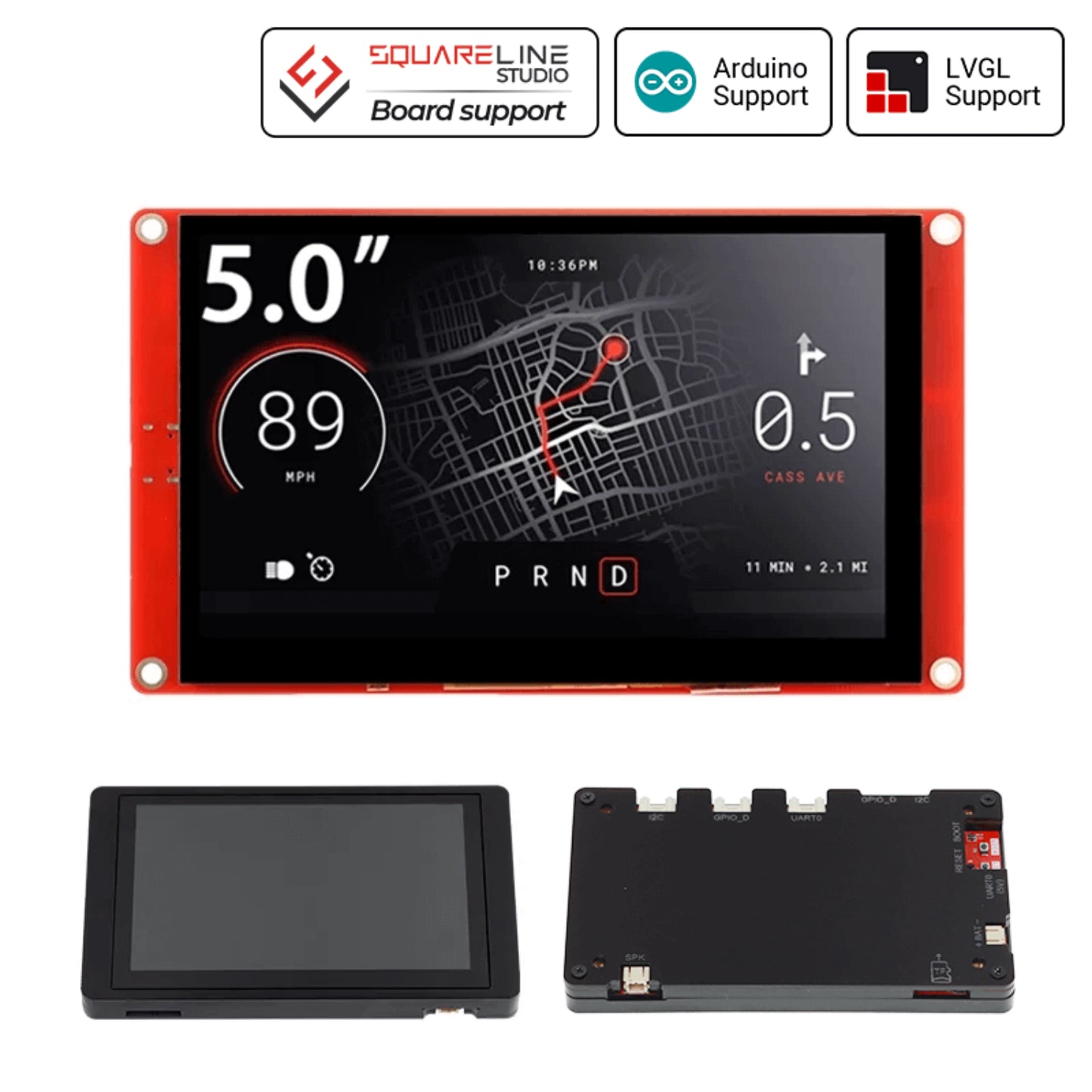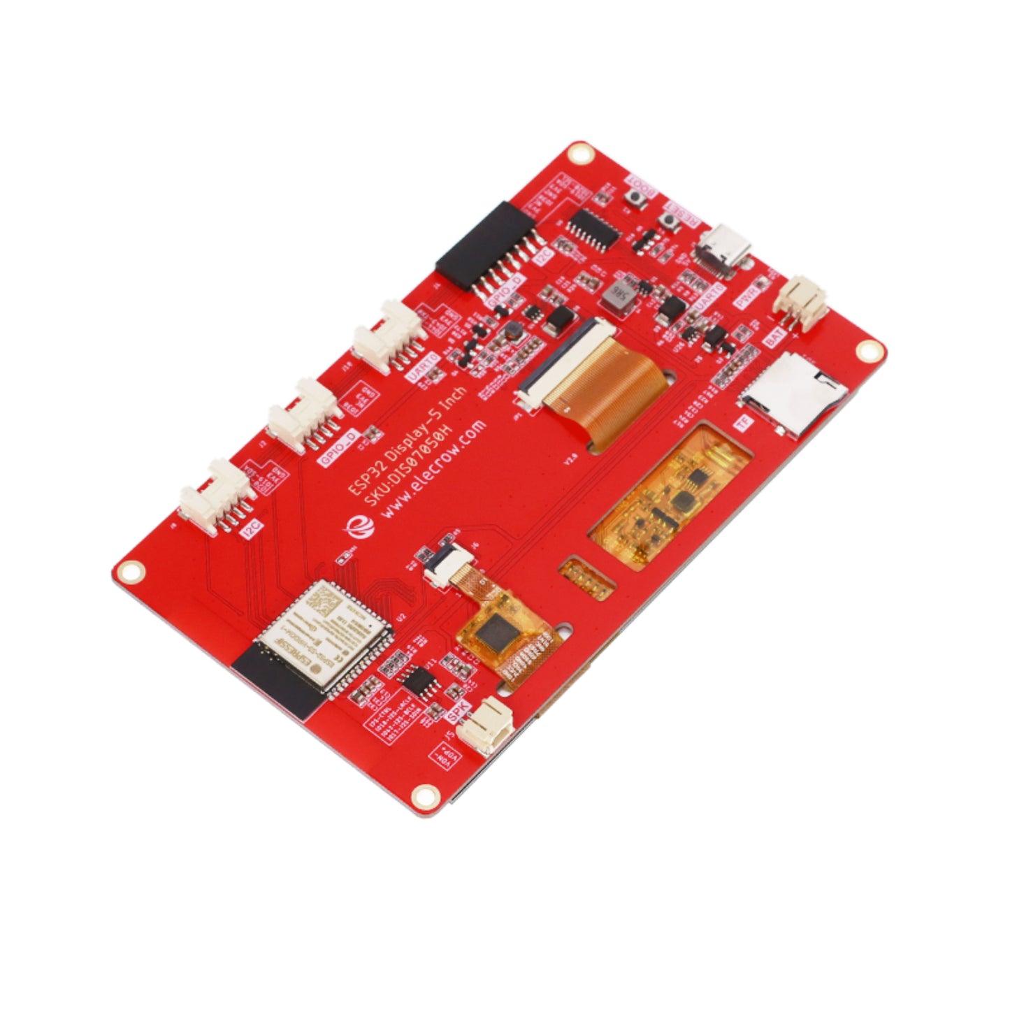 CrowPanel 5.0" HMI includes a 5.0-inch LCD display and a driver board. The display screen uses a capacitive touch technology and the board has reserved a TF card slot, multiple peripheral interfaces, USB interface, speaker interface, battery interface, etc., providing more expansion possibilities. It supports development environments such as Arduino IDE, Espressif IDF, Lua RTOS, and Micro Python, and is compatible with the LVGL graphics library, supports openHASP. This enables developers to not only customize their own UI interfaces but also to create interesting projects quickly and easily, greatly shortening the development cycle.