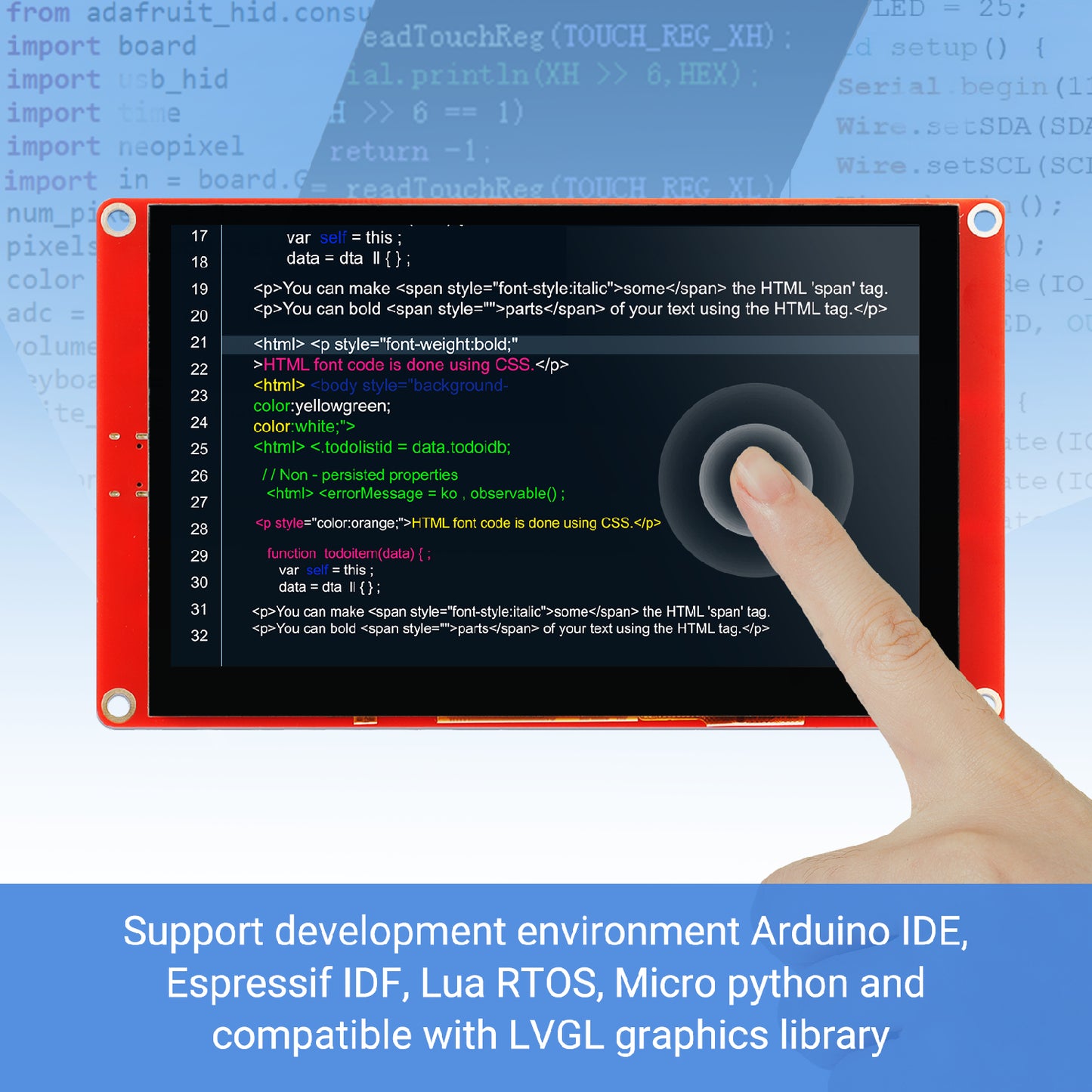 - Support development environment Arduino IDE, Espressif IDF, PlatformIO, Micro python and compatible with LVGL graphics library