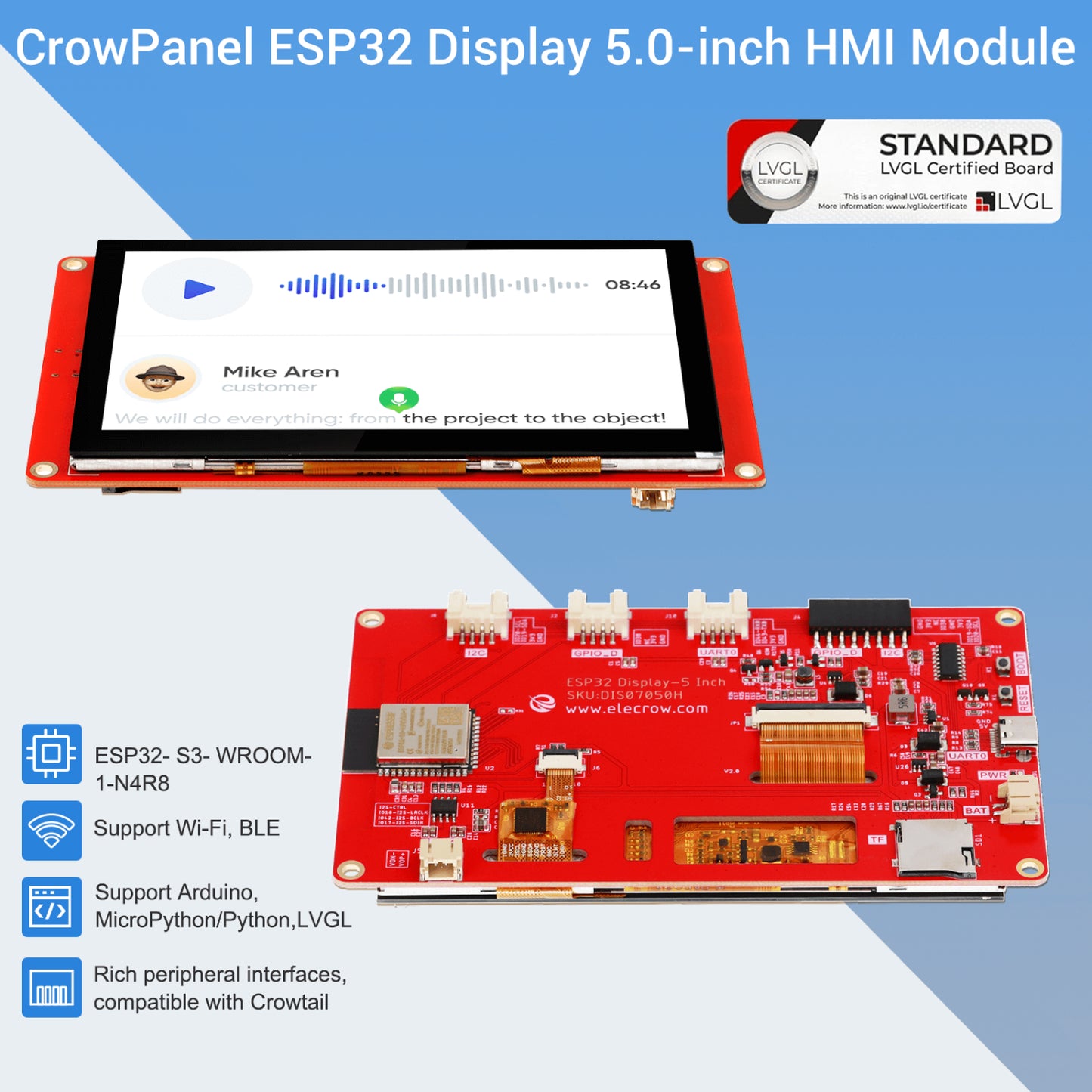 1 x ELECROW CrowPanel-5.0" ESP32 Terminal HMI Display 800x480 RGB TFT LCD Touch Screen Compatible With Arduino/LVGL/ PlatformIO/Micropython