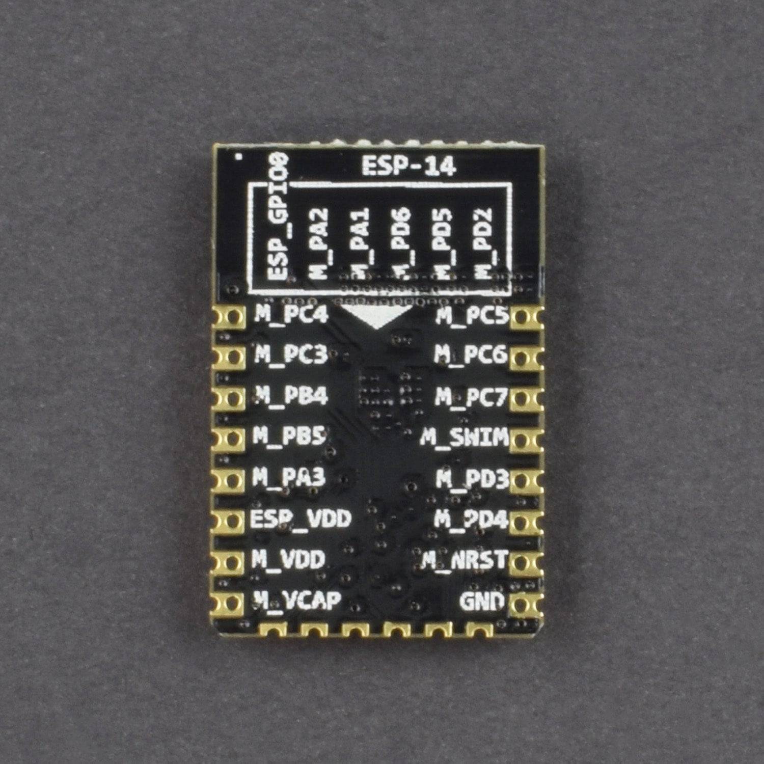 ESP8266-14 It is a low-cost WIFI-MCU communication / Control module, built-in ESP8266 WIFI communication IC and STM8003 Single-chip, the industry's highly competitive package size and ultra-low power technology can be widely used in smart home networking and network field, For connecting the device to the user's physical Wi-Fi Wireless network for Internet or LAN communications, networked functions. The module is built with a powerful STM8003 Chips, all pins all pick out the serial port and its ESP8266 The serial port, you can write STM8 Program by AT Command control ESP8266 The realization of the vast majority of intelligent lighting and home WIFI Things functions.