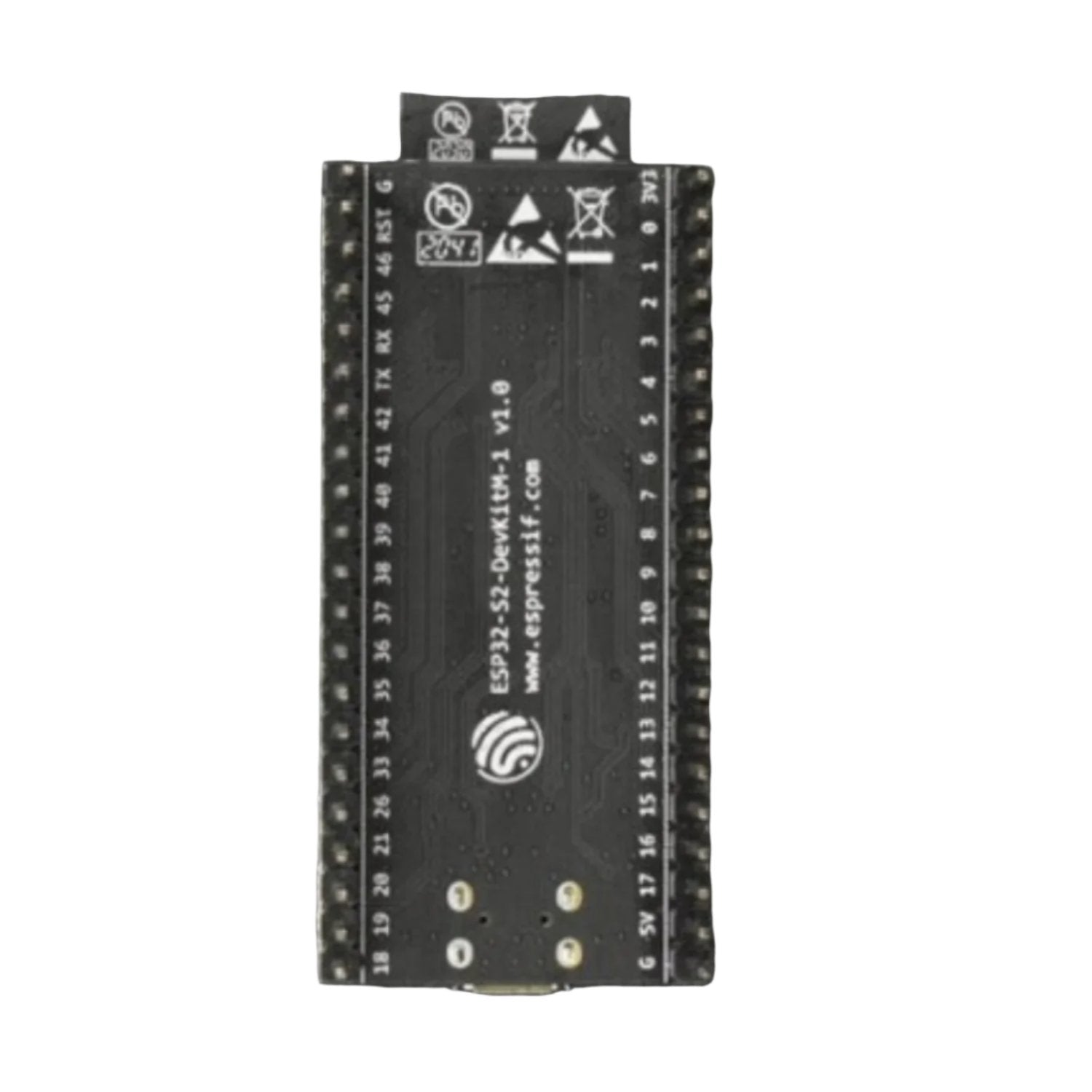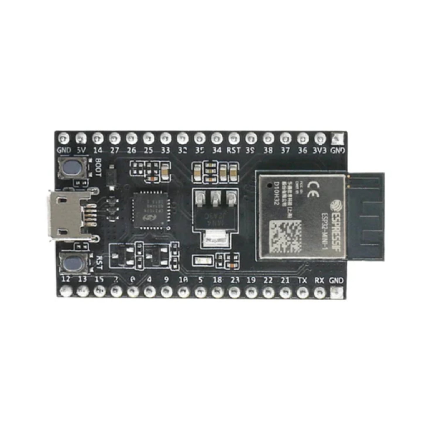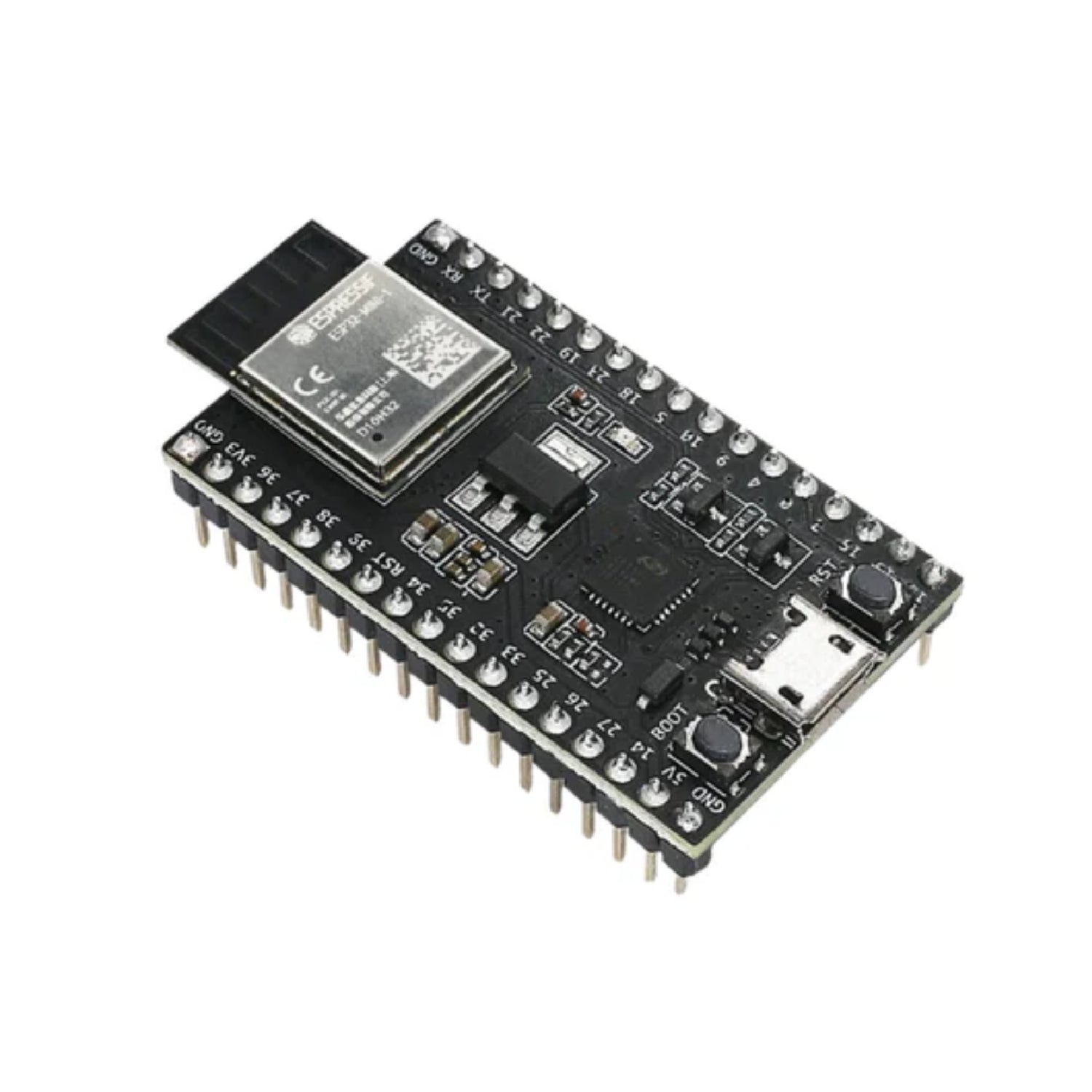 - Micro-USB Port: USB interface. Power supply for the board as well as the communication interface between a computer and the ESP32 chip.