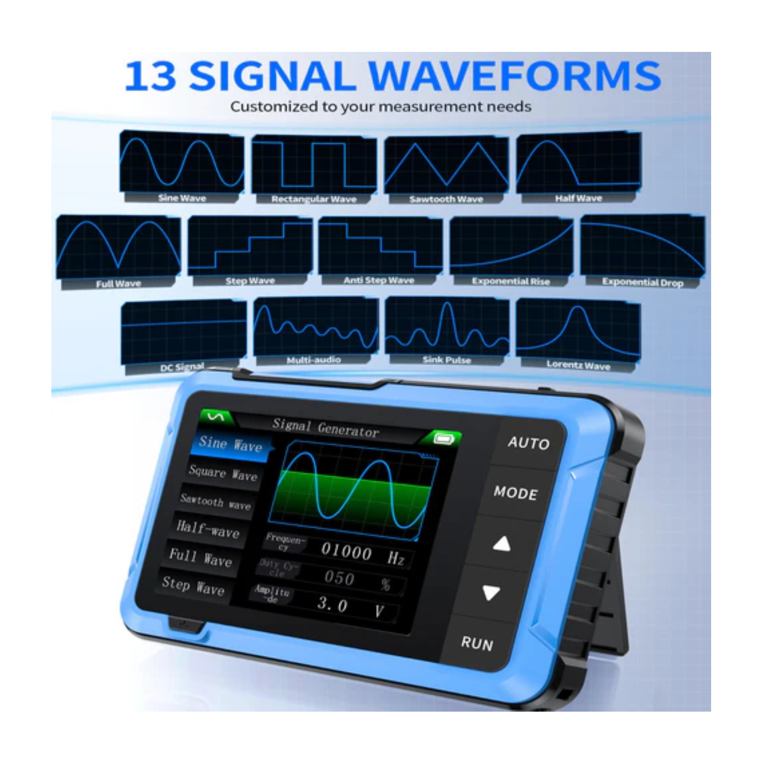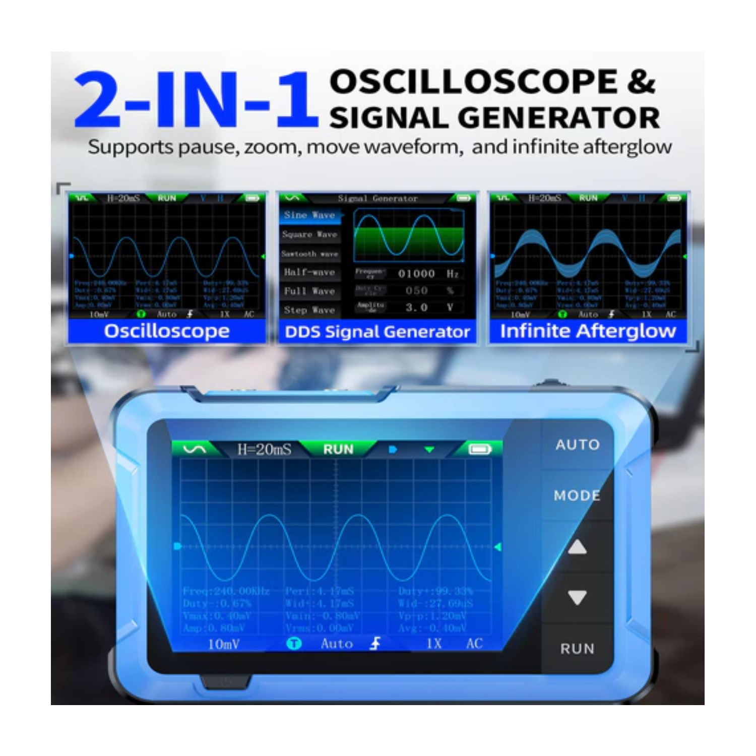 Additionally, it includes a built-in signal generator with a 50KHz output capability, allowing for versatile testing setups. Its 2.8-inch HD LCD screen with 320×240 resolution ensures clear visuals, and the 1000mAh lithium battery offers up to 4 hours of continuous use.
