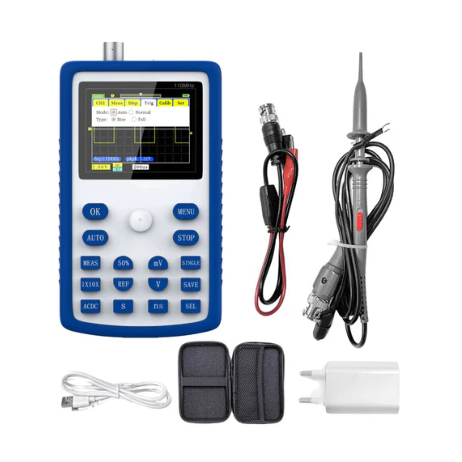 FNIRSI-1C15 Professional Digital Oscilloscope 500MS/s Sampling Rate 110MHz Analog Bandwidth Support Waveform Storage. FNIRSI-1C15 is a fully functional, practical, and cost-effective handheld oscilloscope newly launched by FNIRSI. The real-time sampling rate is 500M, and the analog bandwidth is 110MHz. In addition to all the functions of a conventional handheld oscilloscope, we also added a one-key quick auto function on this basis, so you can easily grasp the waveform like a desktop computer.