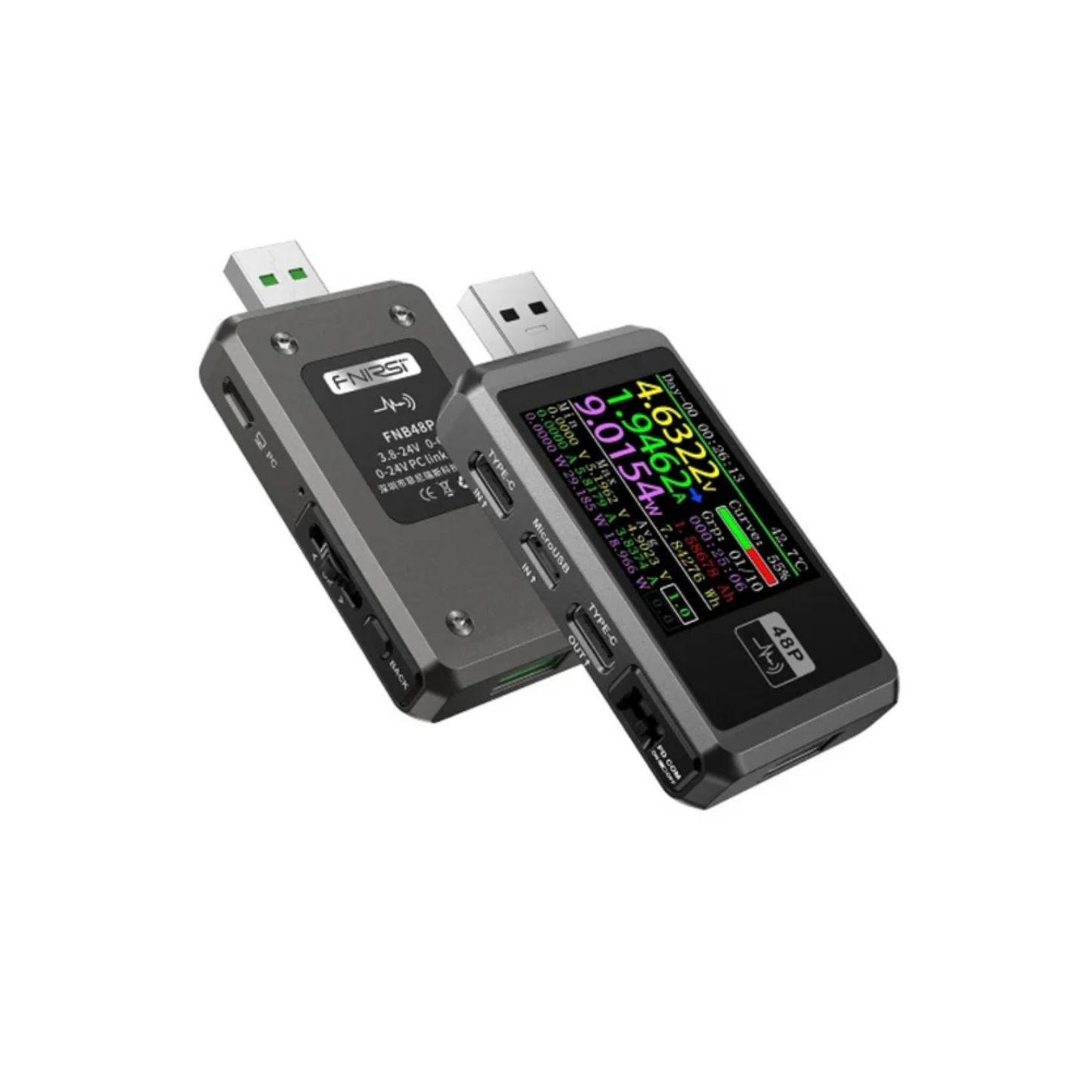 The FNB58 USB tester is a high-reliability, high-safety USB voltage and current detection meter and a mobile communication terminal fast charging trigger. It has a 2.0-inch, full-color, ultra-wide viewing angle TFT LCD display, integrated USB-A, Micro-USB, and Type-C interface. Use external 16-bit ADC, PD protocol physical chip. It can be used to measure the power supply or power consumption of products such as USB interfaces, mobile phone chargers, and U disks; it can be used to measure the charging power of mobile phones and the input and output of mobile power supplies; it can be used to test the fast charging protocol of chargers.