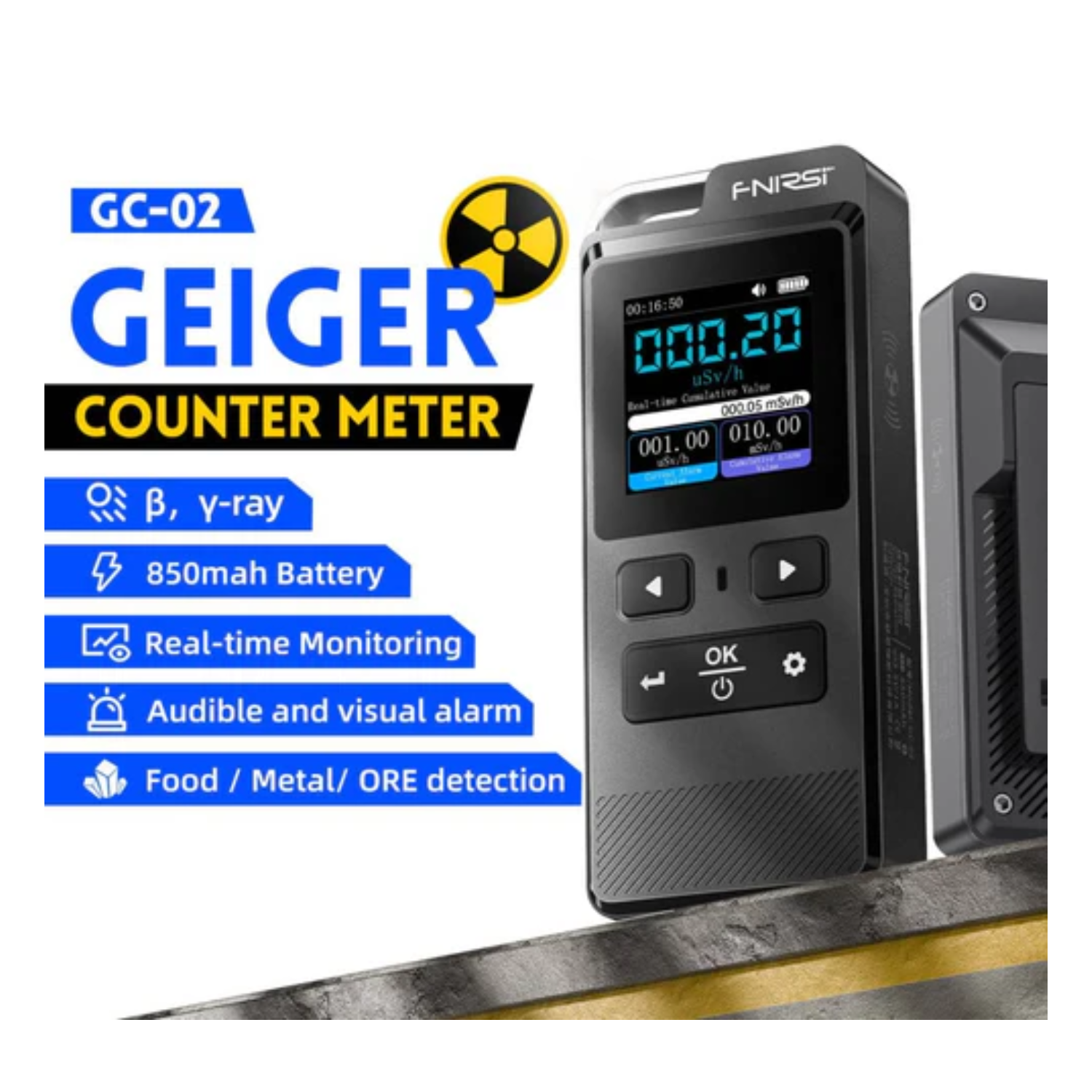 Added new scheduled monitoring mode and historical viewing, which can record 10 sets of data and save it without losing it. Built-in 850mA rechargeable lithium battery, battery life is up to 6 hours. GC-02 is an ideal tool for detecting nuclear radiation anytime and anywhere, giving you peace of mind, accuracy, and convenience.