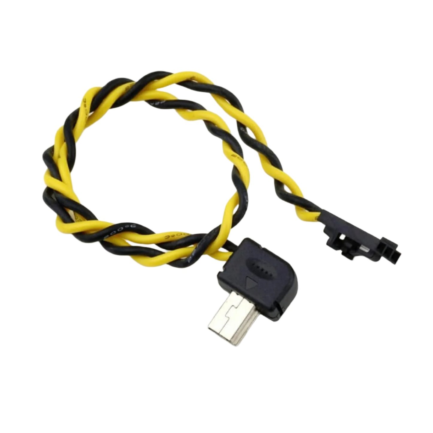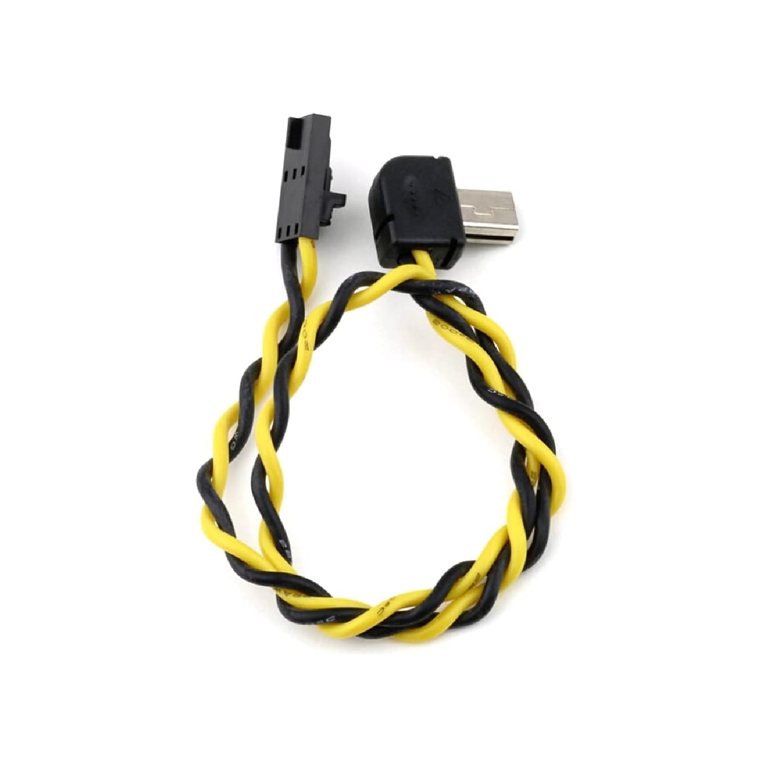 This cable has a 90-degree USB connector so you can fit the cable more securely to the camera without extruding the plug. You will also be able to fit your camera into a more tight space. This cable works with all video transmitters, such as Fatshark. The yellow pin goes to the video signal pin on the VTX and the black pin goes to the Ground on the VTX.