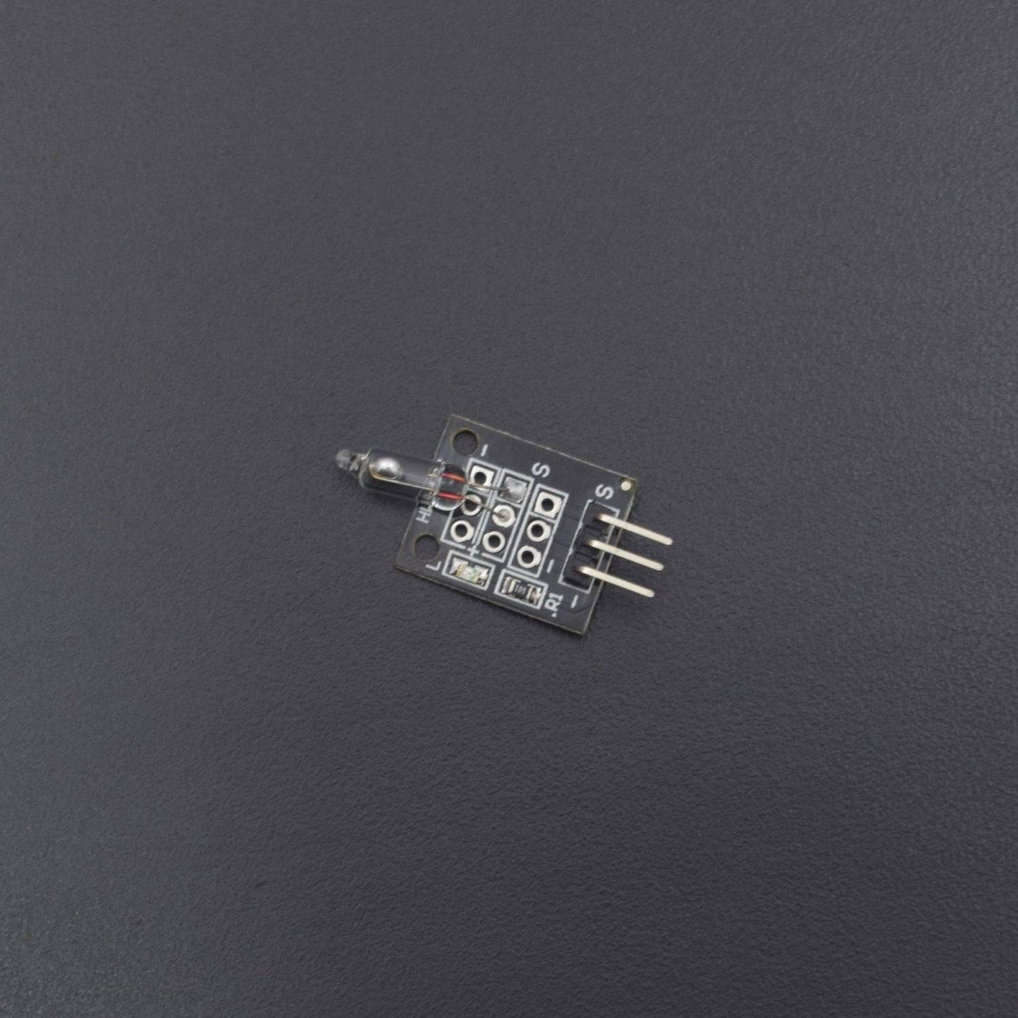 The mercury tilt switch module uses a small mercury ball that completes the circuit when you tilt the module. It consists of a mercury switch, a 680Ω resistor and a LED that will light up when tilt is detected. The mercury ball will open/close the circuit when the module is rotated.