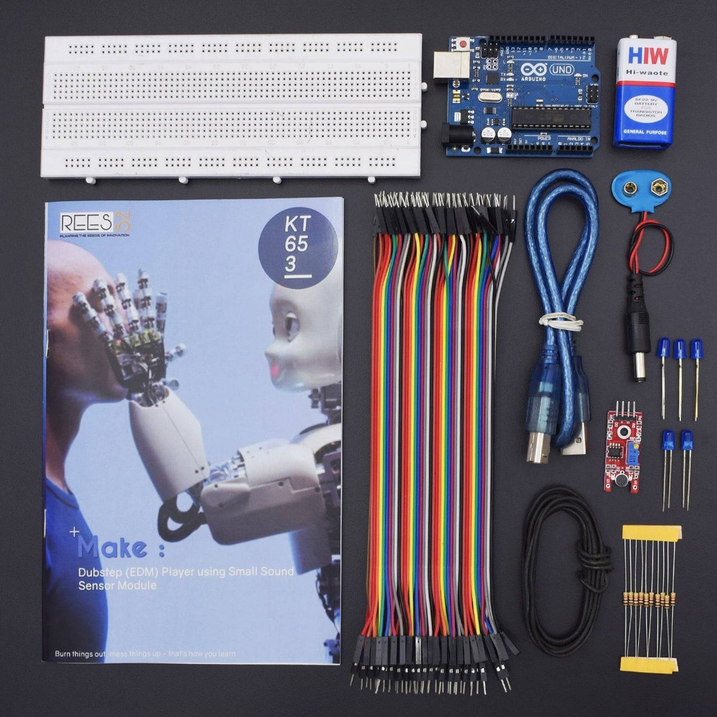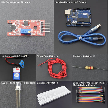In this particular project, we will hook up the sound sensor to an array of LED lights which will beat with music, clapping or knocking. It can be used for controlling various other components.