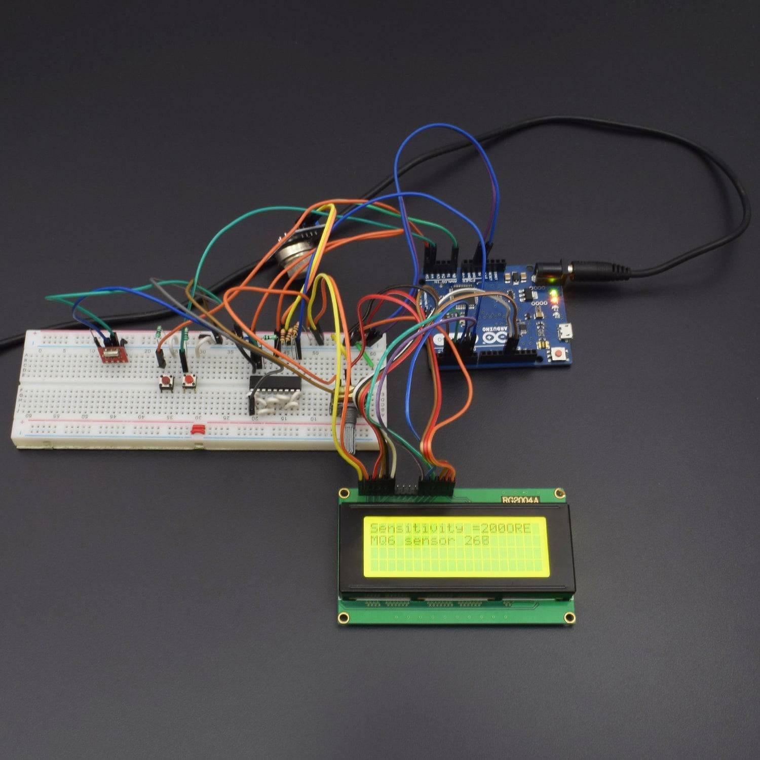 16X2 LCD - The 16X2 LCD display is used to display the increment or selection of sensor's sensitivity. It is connected to the Arduino board by connecting its data pins to pins 2 to 5 of the Arduino board. The RS and E pins of the LCD are connected to pins 13 and 12 of the Arduino UNO respectively. The RW pin of the LCD is grounded.