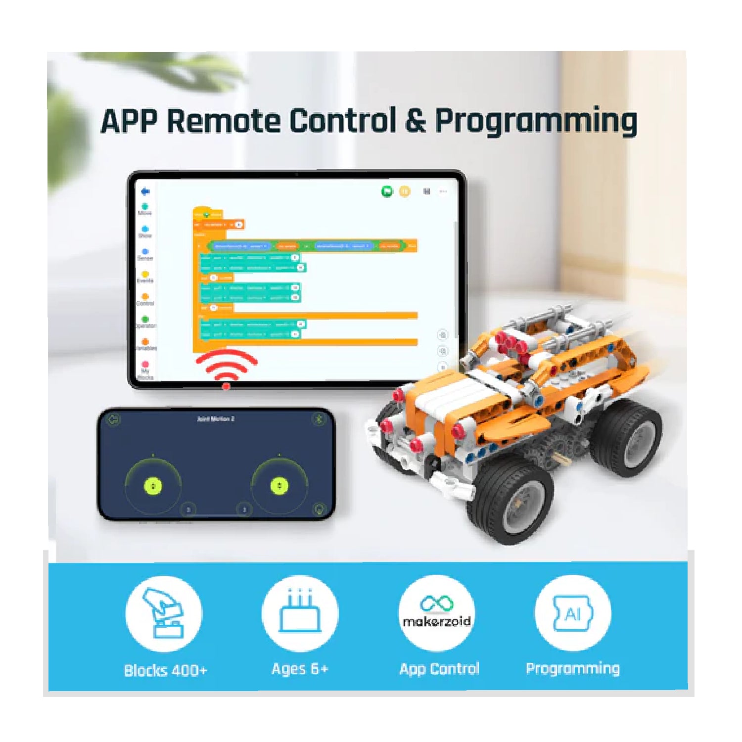 - With the FREE MAKZERZOID app from the App Store and Google Play, via Bluetooth connection with smart devices, kids can build the models easily from the "Build" section and then control the motorized robot to move in all directions which brings so much joy.