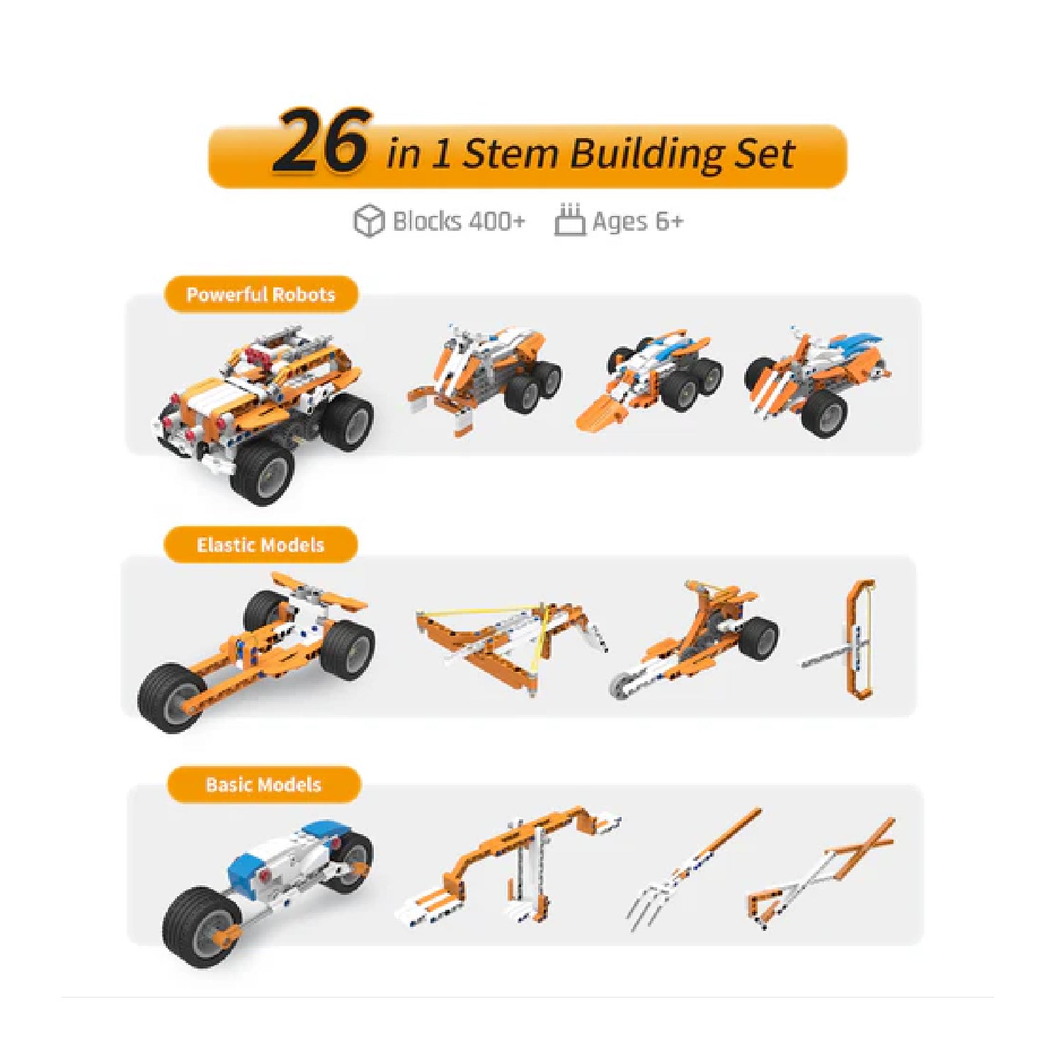 Over 26 robots can be assembled with the 400+ blocks of Superbot Coding Robot kit, Such as powerful robot cars, trucks, drawing machines, and elastic robots... Integrated Motors and 2 IR sensors make the robot move around smoothly. Even playing racing car battle games!
