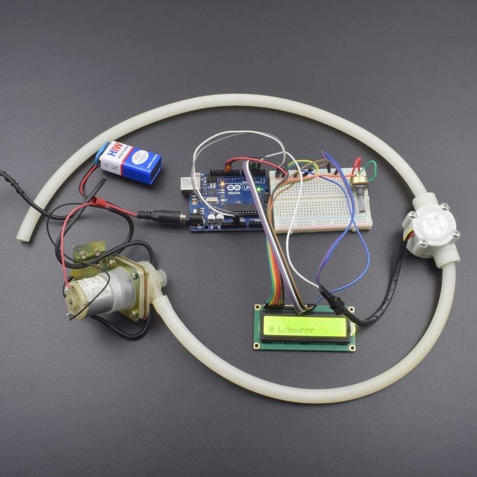 HERE we connect the water flow pump 12 dc motor use for flow the water between the water flow sensor you see the result on lcd 16*2