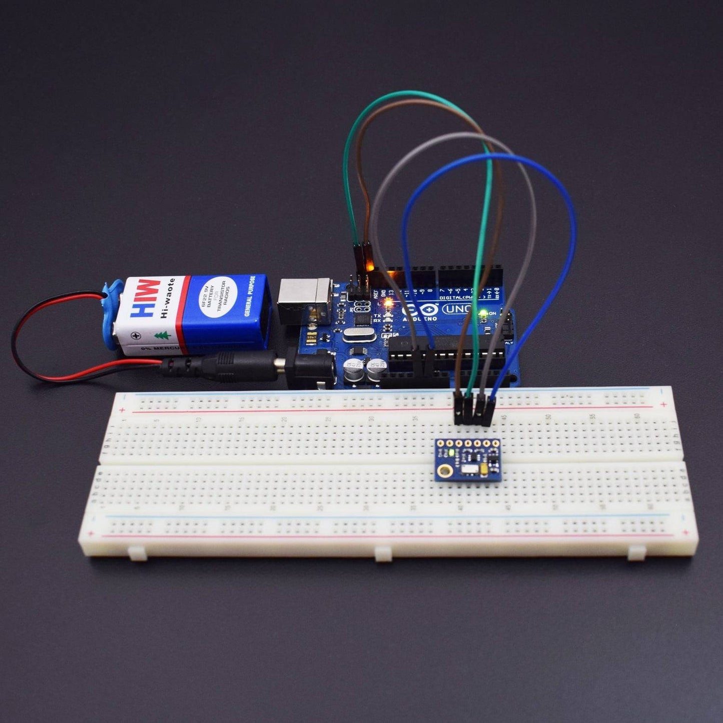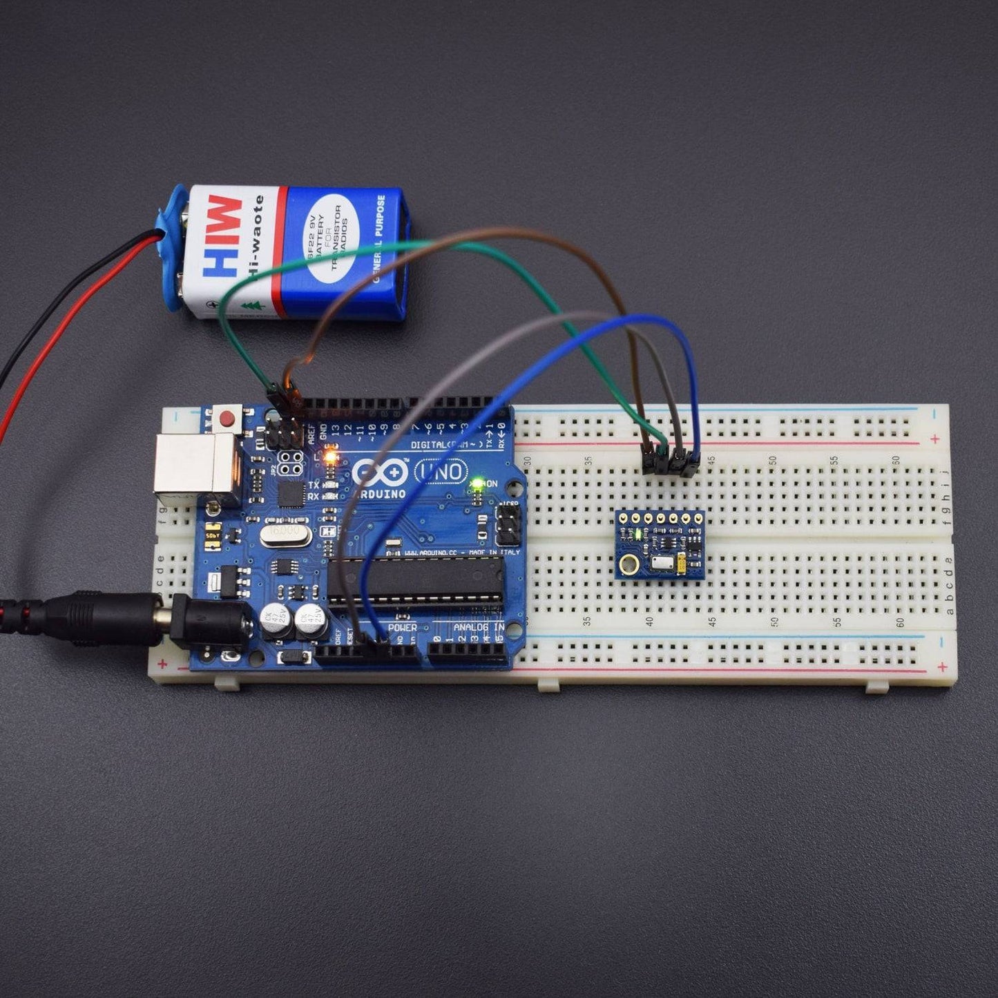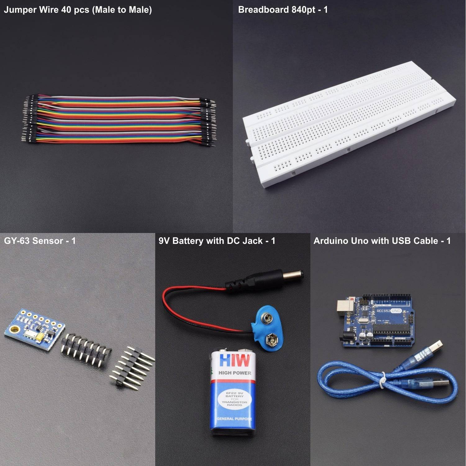 - The GND (GY-63) is connected with GND pin in Arduino Uno board and VCC (GY-63) is attached to 5V (Arduino Uno) to build a circuit which measures both the temperature and pressure.