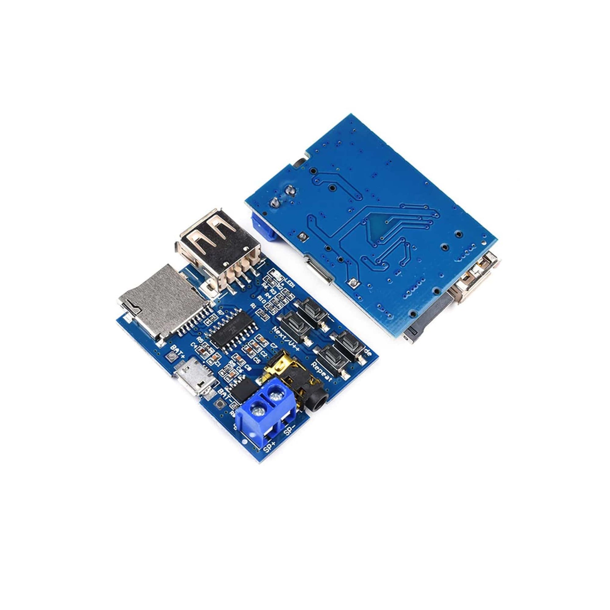 The MP3 Module with Self-Powered TF Card U Disk Decoded Player module is used for playing tracks in the MP3 format stored on a micro SD card or USB memory. The MP3 Module is the perfect device for playing messages on platforms, warning signals, etc. Superior sound quality. The onboard 2W mono amplifier (5V power of up to 3W) is connected to the speaker (recommendation 4 Ω 3W speakers), 3.5mm gold plated headphone jack can connect with headphones or external audio. MP3 Module comes with a MicroUSB port. Through the mobile power supply, 3.7V lithium battery, or USB 5V power supply. MP3 Module supports TF Card (mobile phone memory card) and U disk play mode. No soldering with speaker terminals for easy wiring. The module is designed to modify.