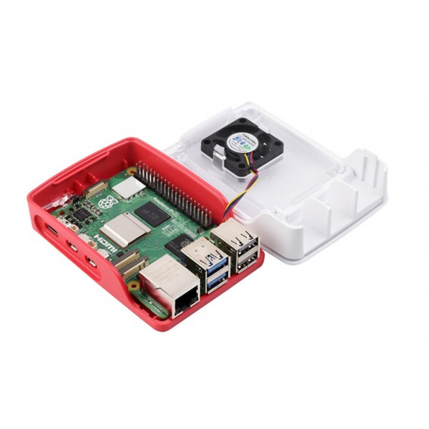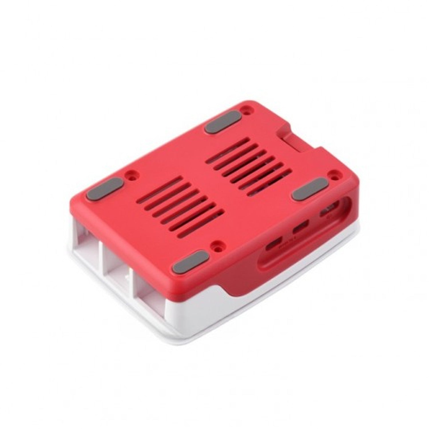 The Official Raspberry Pi 5 Case for the Raspberry Pi 5 is a four-part case that clamps together and features an active cooling fan. It keeps your Raspberry Pi 5 at a comfortable operating temperature, even under heavy load. It is available in white and red color.