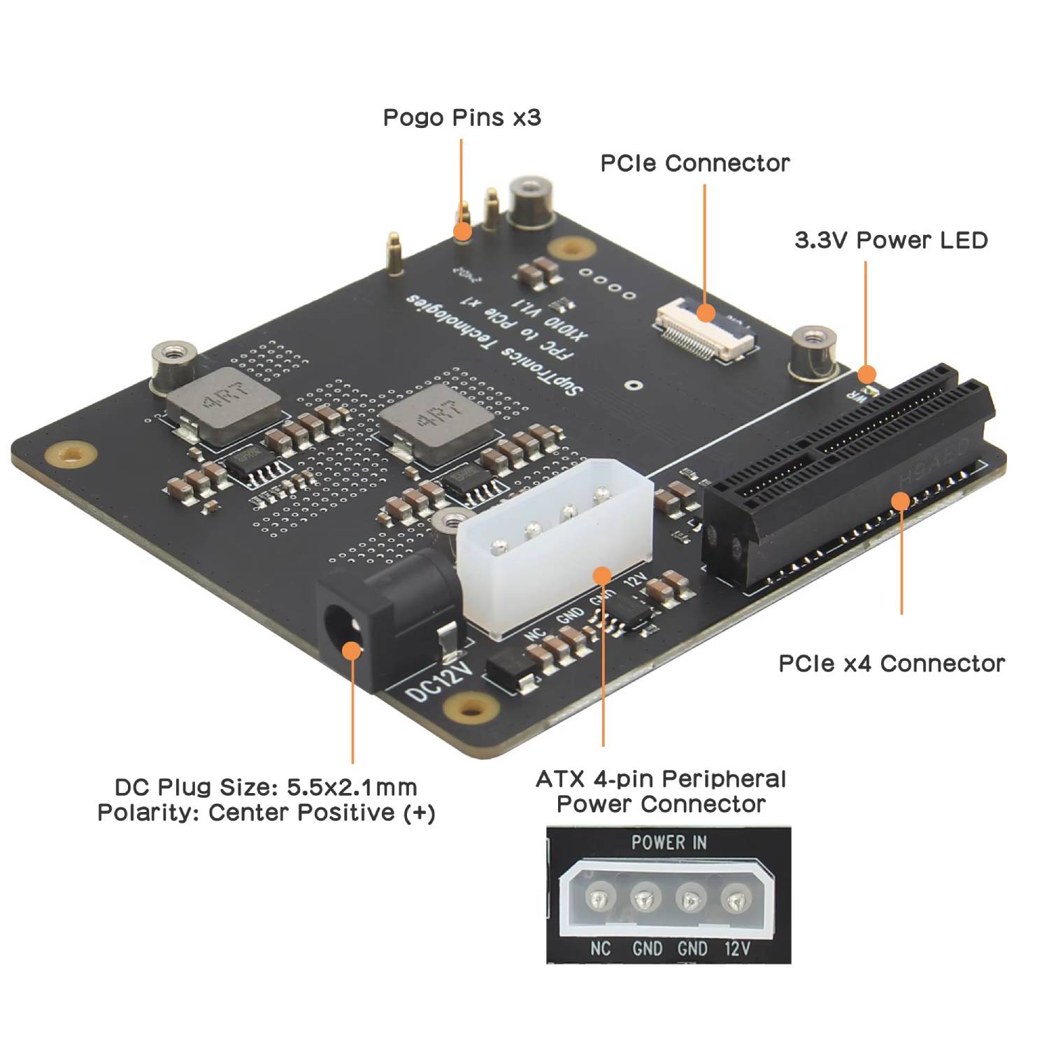 The X1010 offers versatile power input options with a standard DC jack and an ATX 4-pin peripheral connector, and its efficient DC/DC converters deliver up to 5.5A for the Pi 5 and 3.3V at 5.5A for the PCIe device. Designed for seamless integration, the X1010 connects to the underside of the Pi 5, maintaining full compatibility with your existing HATs.