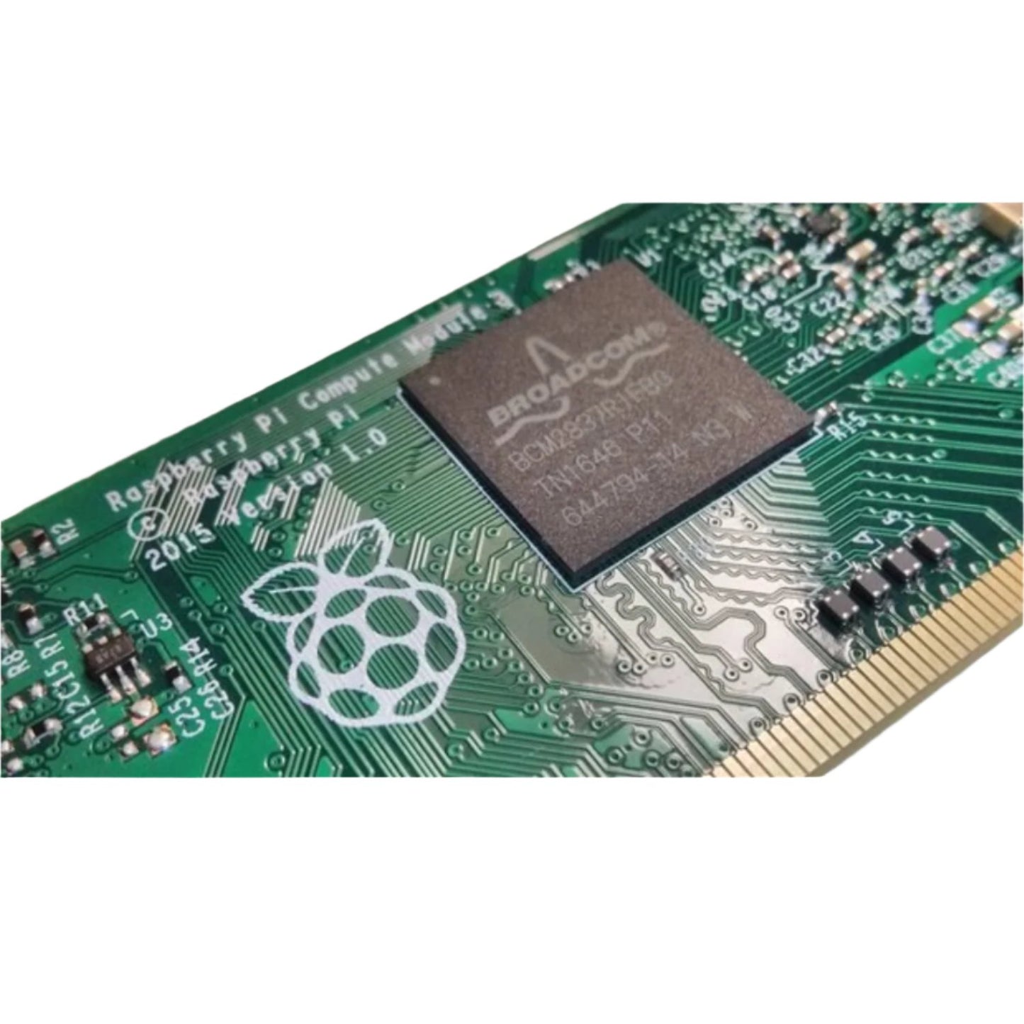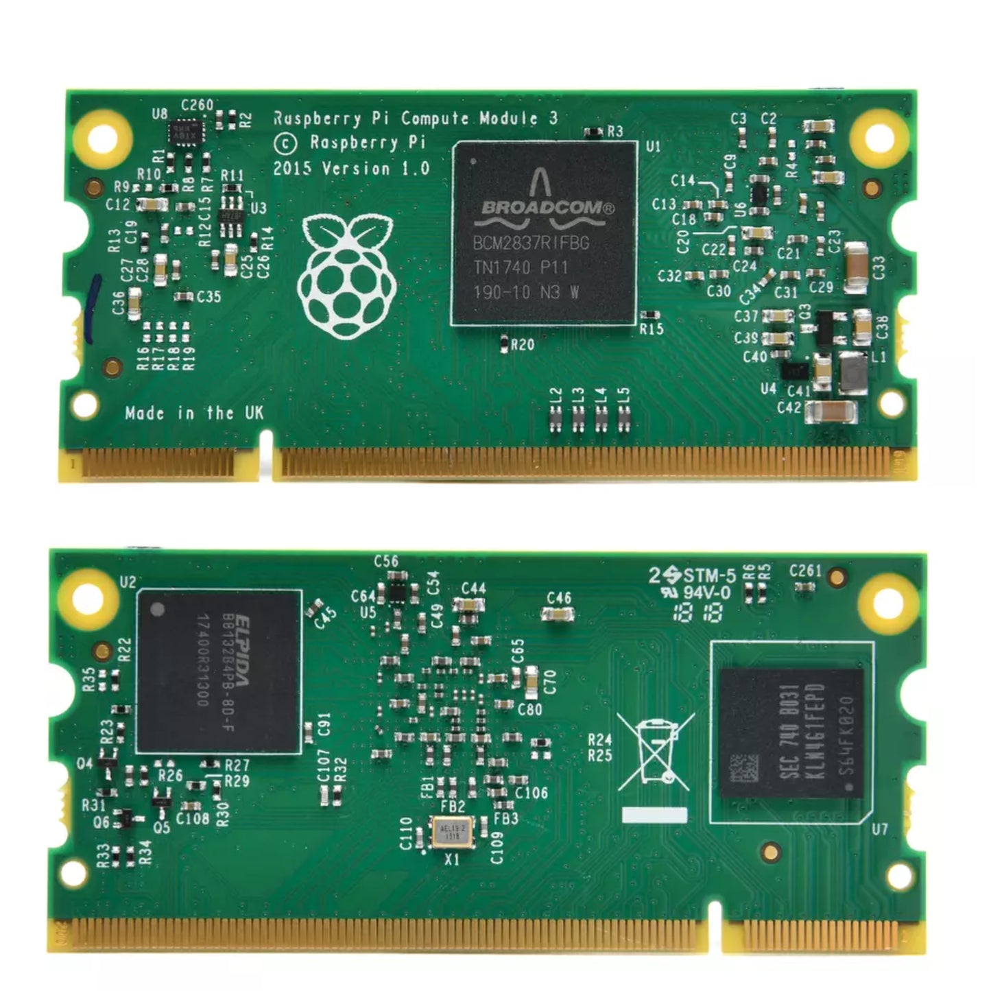 The Compute Module 3 contains the guts of a Raspberry Pi 3 (the BCM2837 processor and 1GB RAM) as well as an optional 4GB eMMC Flash device (which is the equivalent of the SD card in the Pi). The Pi 3 has a processor speed of 1.2GHz and runs at roughly 10 times the speed of the Pi 1 due to its quad-core CPU.