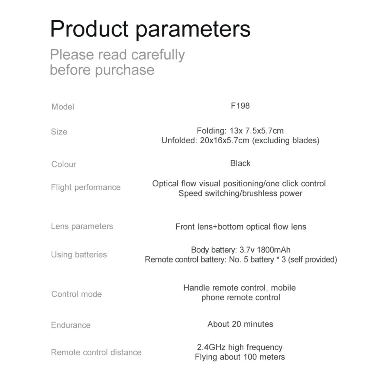 Take your aerial photography to the next level with the F198 Drone. Designed for both beginners and enthusiasts, this foldable quadcopter combines powerful performance with a sleek portable design. Whether you’re traveling, capturing cinematic shots, or just enjoying flying, the F198 delivers stable, smooth, and stunning results.