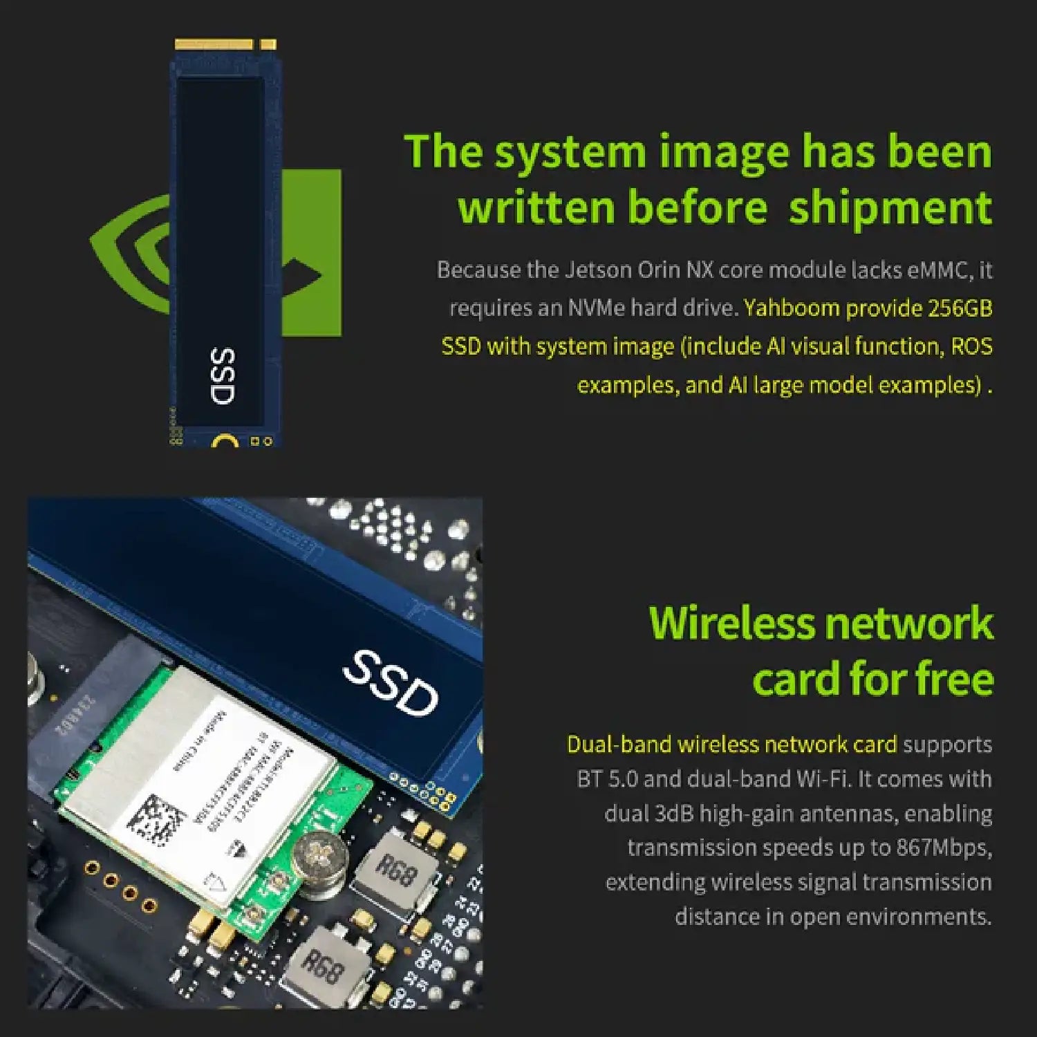 | Ready Out-of-Box | Pre-installed Ubuntu + JetPack on 256GB NVMe SSD with Wi-Fi & power supply | Zero setup time — boot & develop instantly |