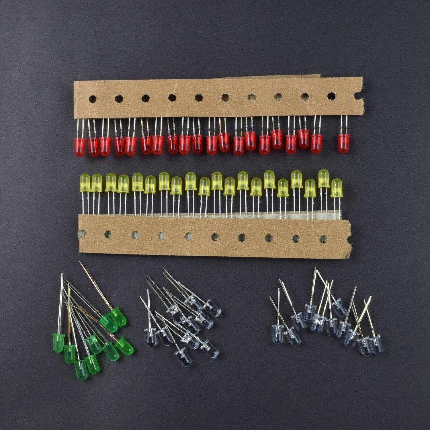 High-clarity round-head indicator LEDs — choose 3mm or 5mm diameter in Red, Green, Yellow or mixed-color packs. These standard through-hole LEDs are manufactured to industry specs and commonly used for panel indicators, status lights, DIY electronics, Arduino/ESP projects and educational kits.