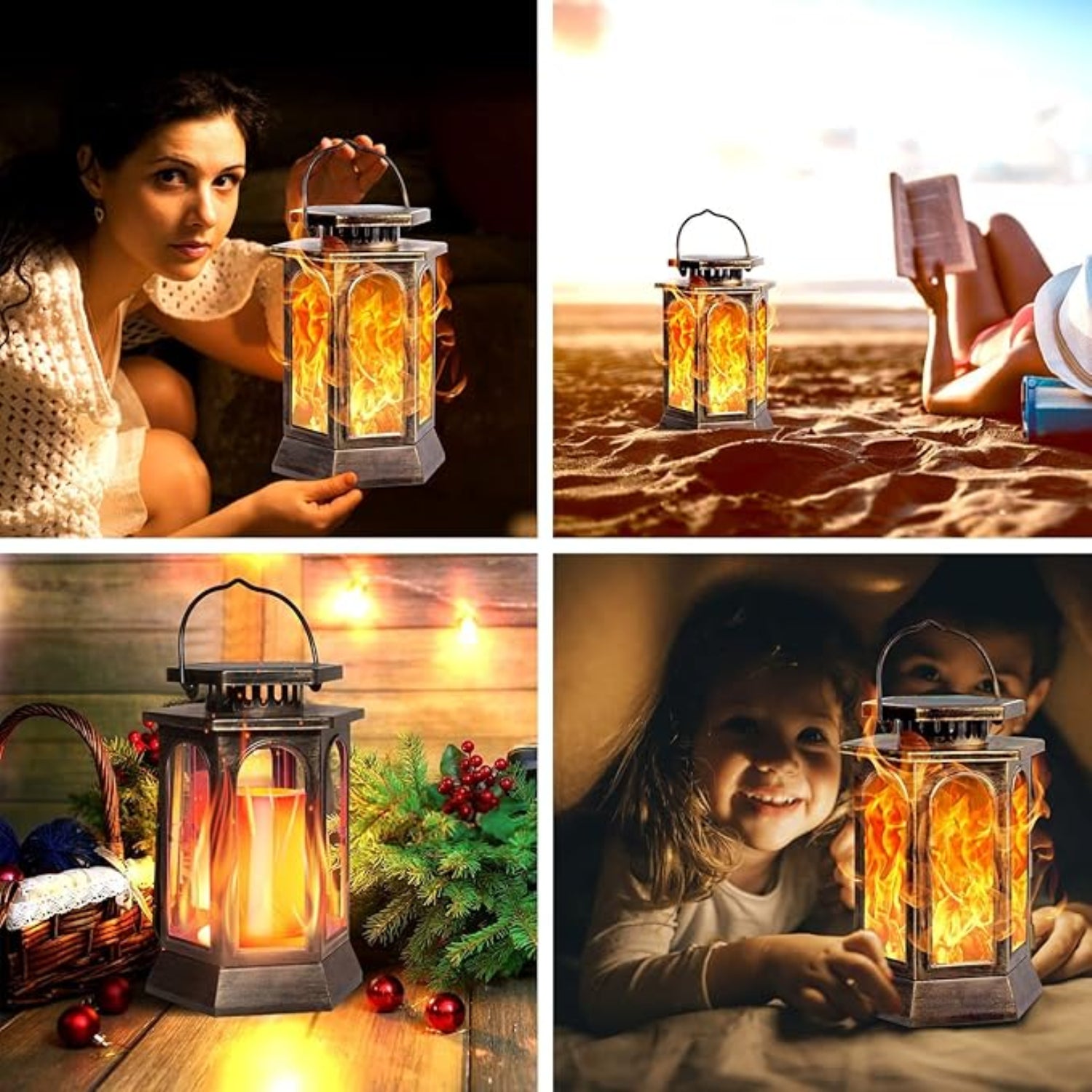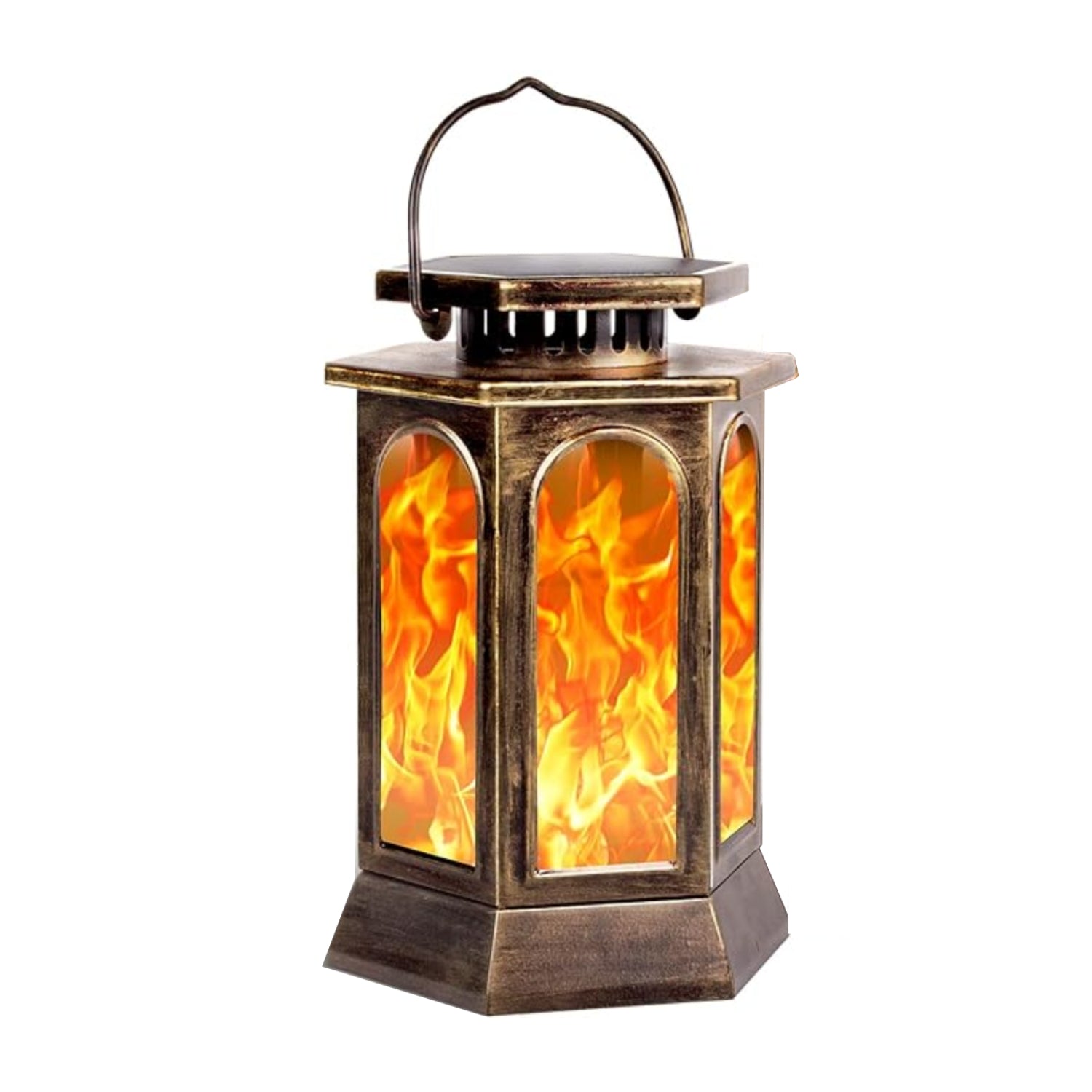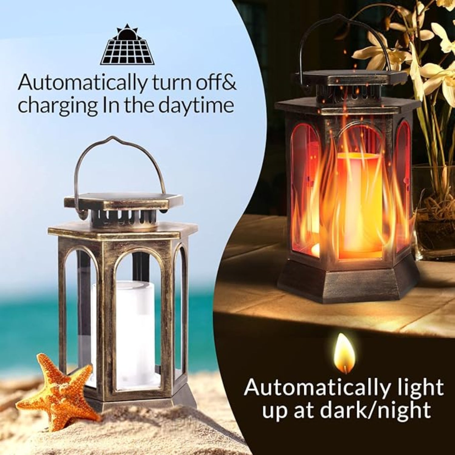 Upgraded Metal Solar Lantern with Flickering Flame has built-in high-efficiency solar panel and rechargeable Li-ion battery (1800mAh). It is solar powered and energy saving. The solar flame Lantern lights can light more than 10 hours with only 6-8 hours charging time. It is unique designed with high efficiency solar panel, which ensure perfect working performance. Through photosensitive sensor, it collects solar energy all day and they can turn on the bulb automatically at dusk and turn it off when it's dawn.