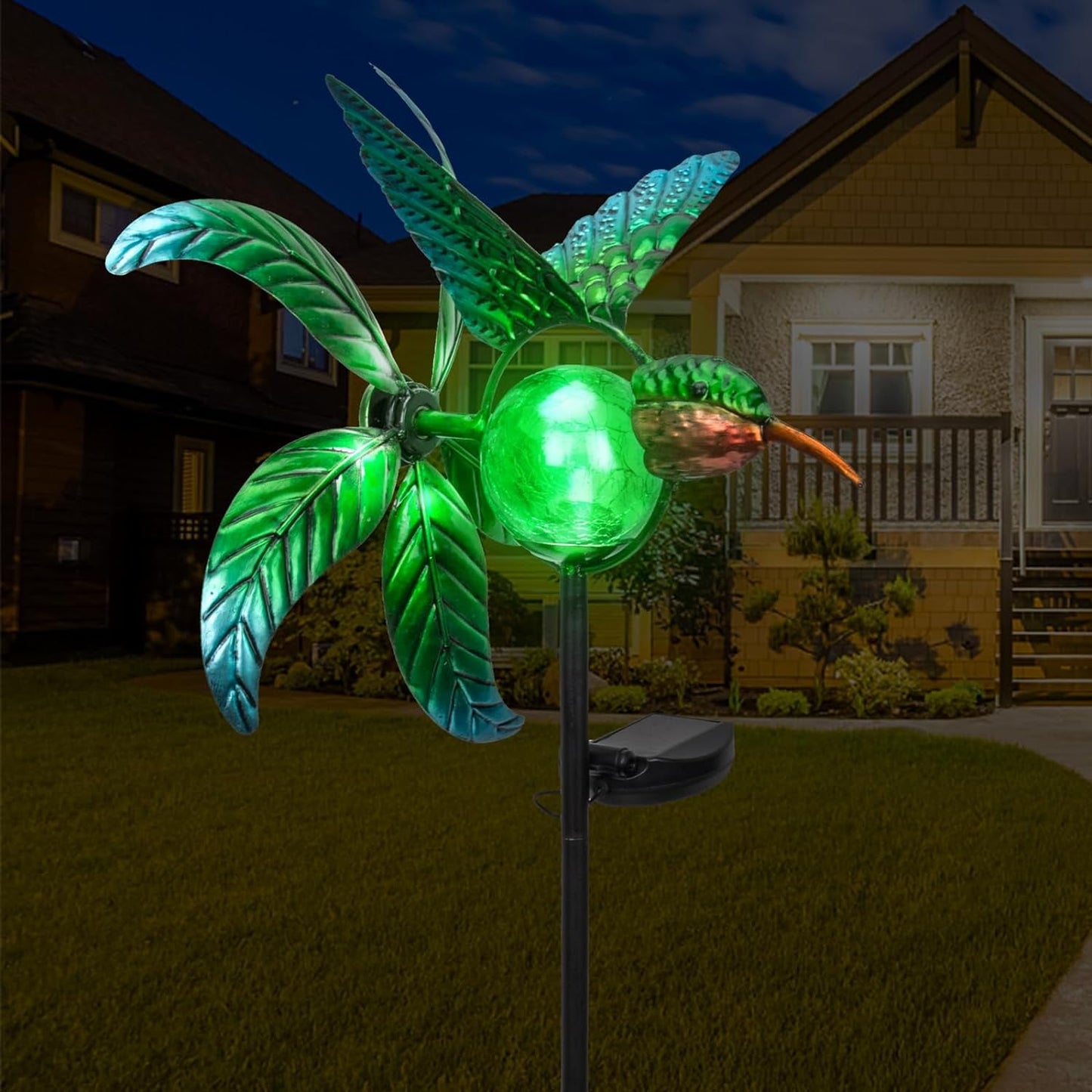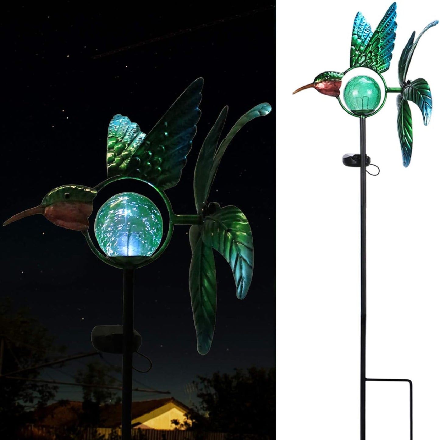 The hummingbird wind spinner with cracked glass ball, when the cracked glass ball is close to a light-colored wall or background, a reflection effect will occur at night, which will produce a gorgeous visual effect! Whether it is used to decorate the garden or as a gift, it is a very good choice.