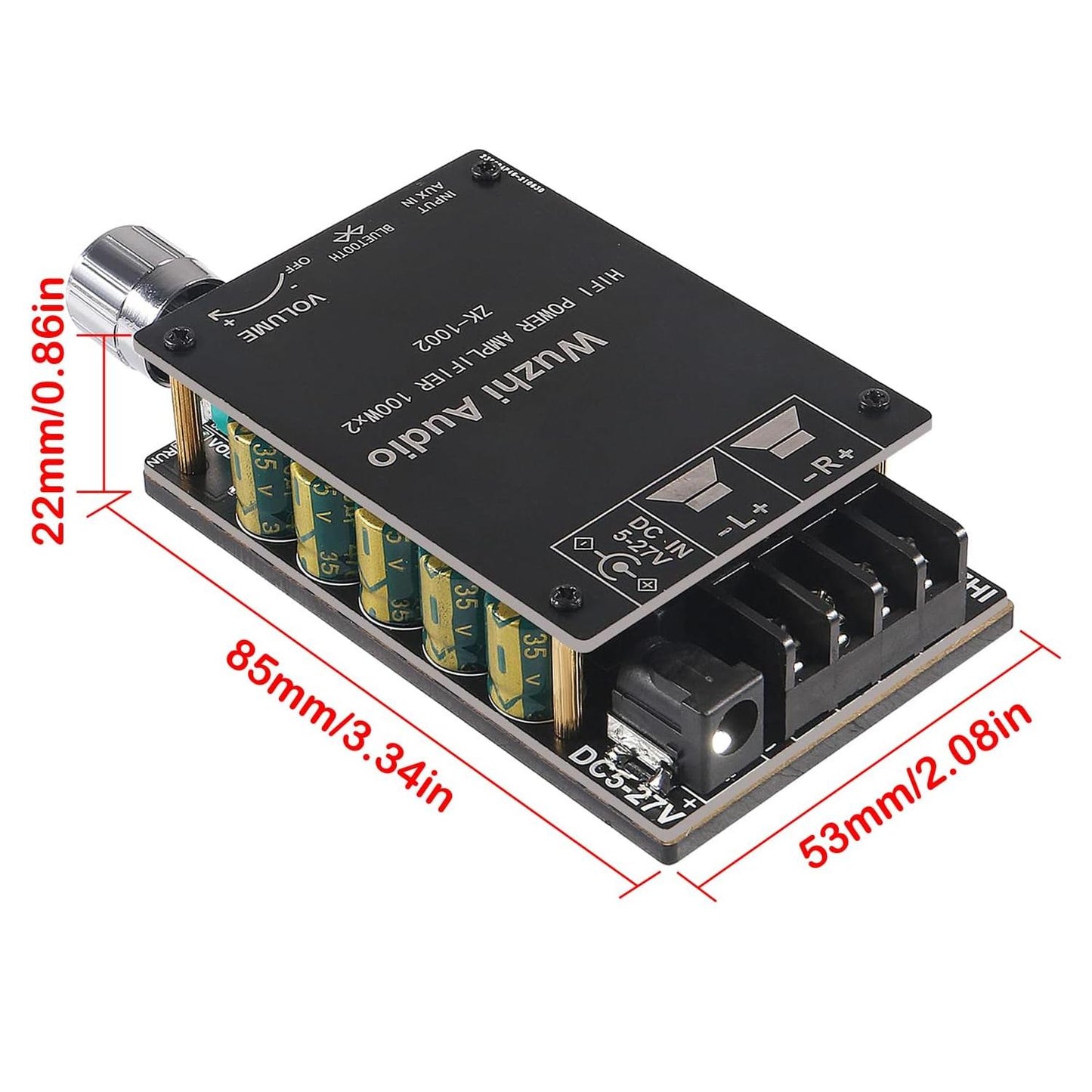 The ZK-1002 audio power amplifier is very small, measuring 8.5 x 5.3 x 2.2 cm / 3.35 x 2.08 x 0.87 inch. It has dual-channel stereo output power of 100W+100W and is suitable for 4-8Ω speakers. For the best effect, it is recommended to use 50-100W speakers.