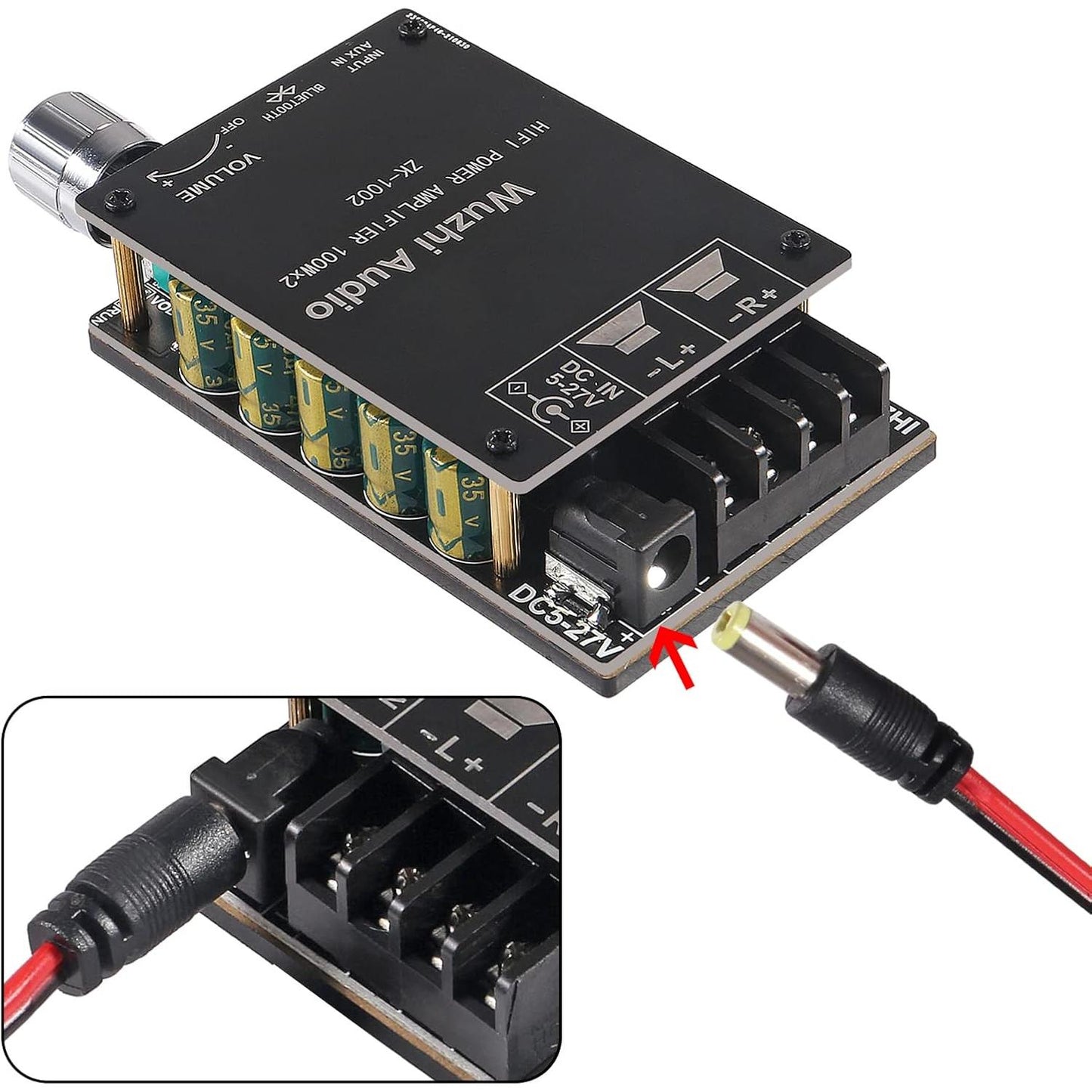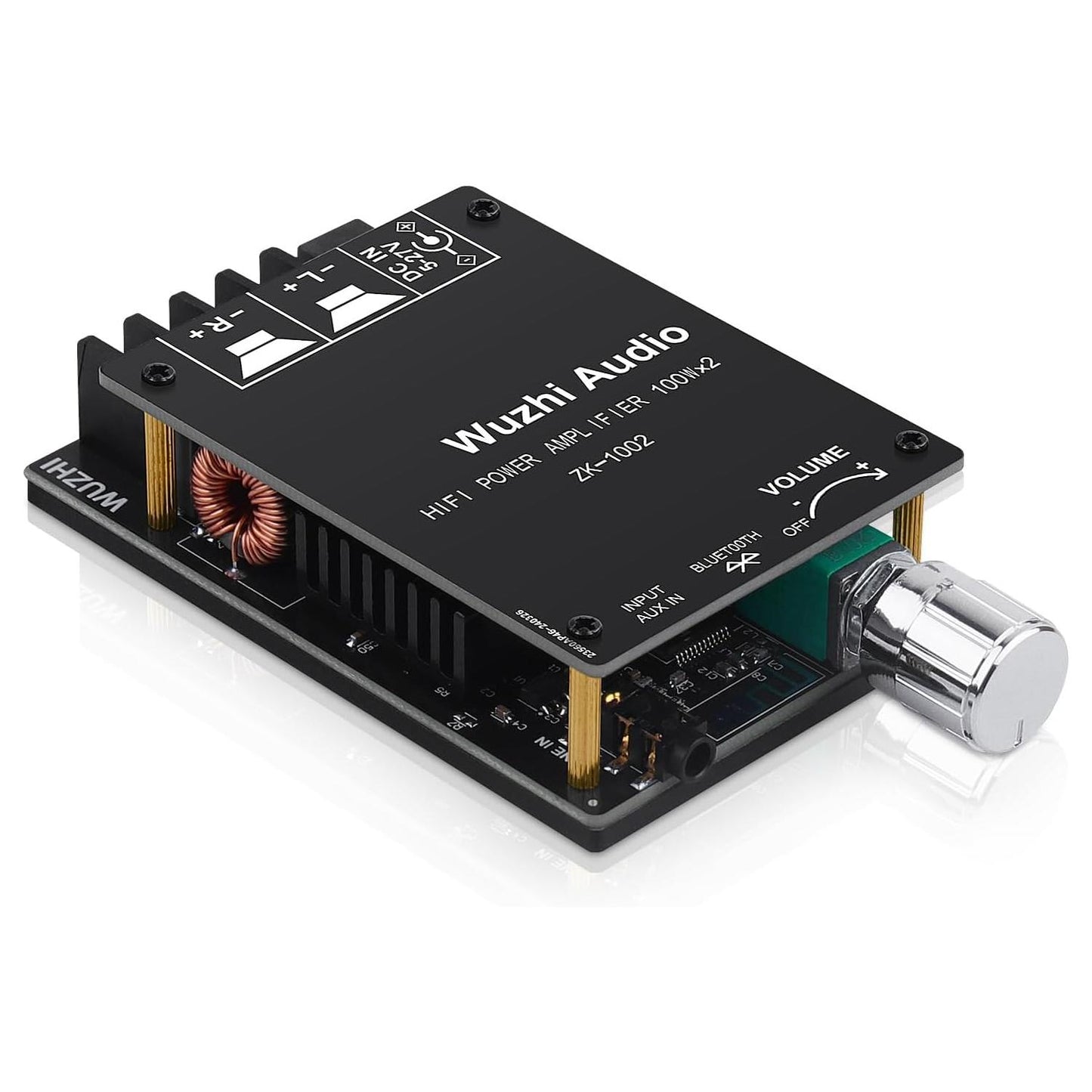 This ZK-1002 Mini Bluetooth audio amplifier board is a 2.0 channel amp, it can contact two passive speakers (20-200W, 4-8Ω), DC7-24V/5A above. this power amplifier with two TPA3116D2 chips, 4*red and gray ring inductors, a distortion rate below 0.3%, and another upgrade large chips that support AAC BT decoding, APP, low latency