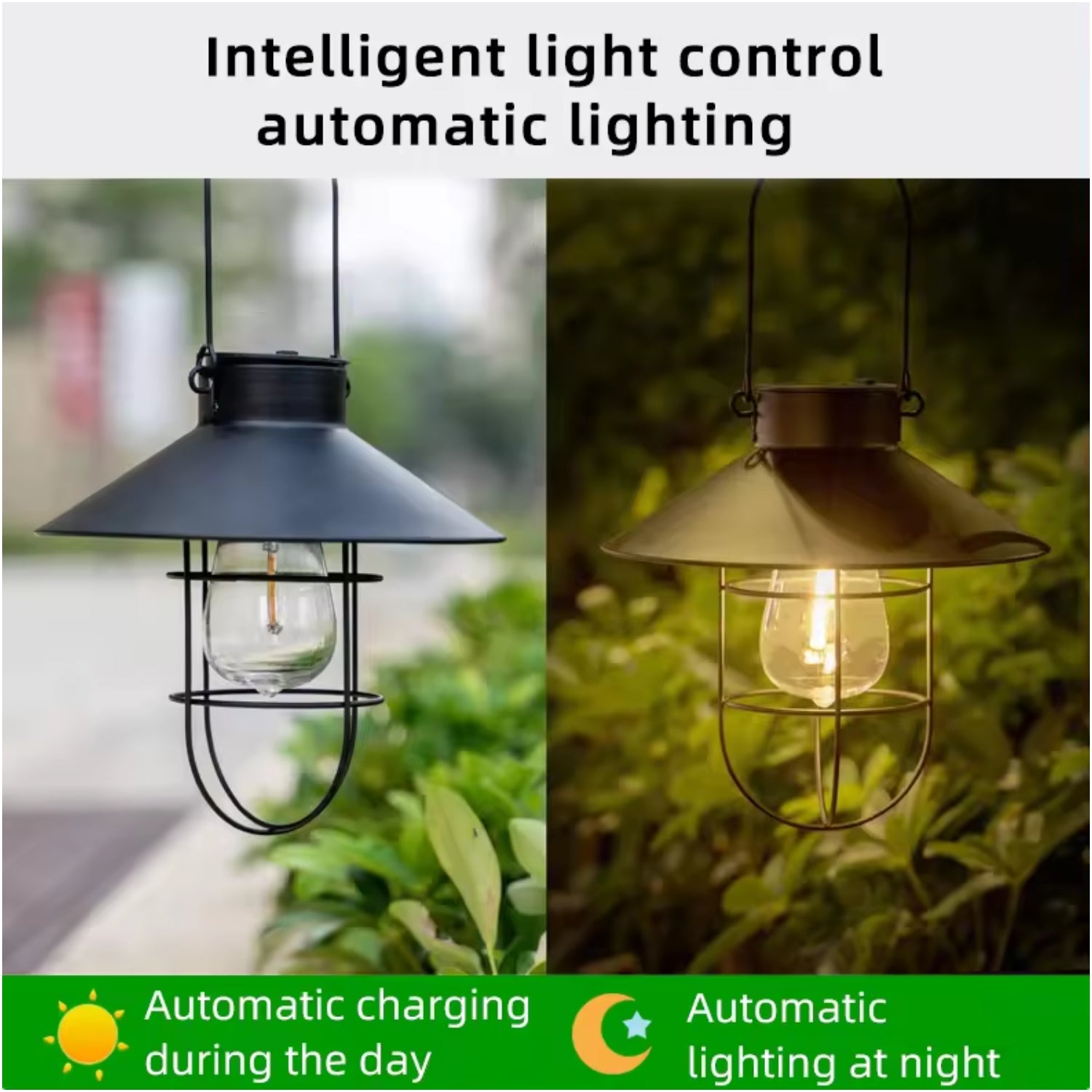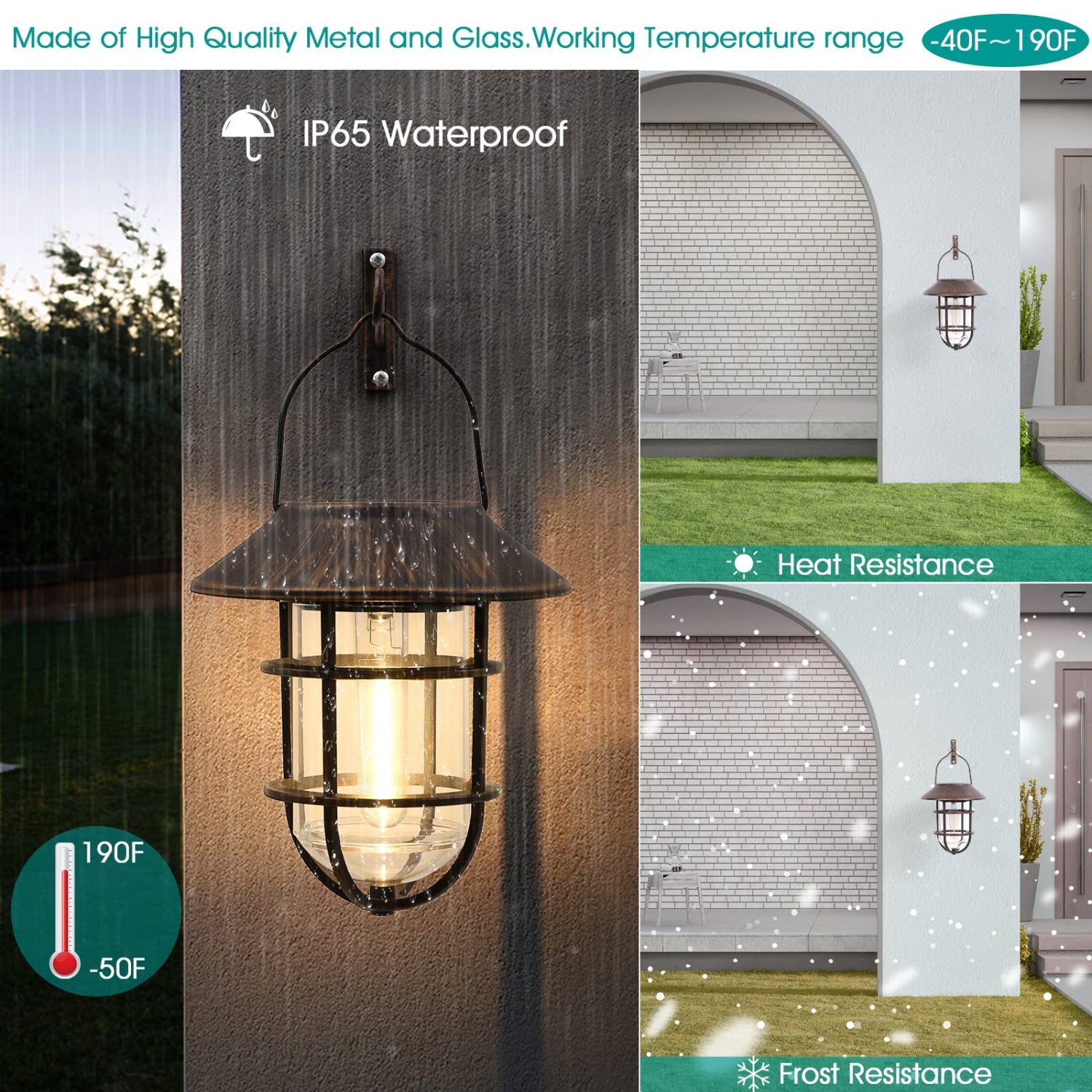 Solar hanging lanterns outdoors are made of quality metal material to ensure solar lanterns can stand up to the elements and bad weather. P65 waterproof rating makes sure solar wall mount hanging lanterns withstand rainy days, hot days, frost days and snowing day without any leaks or trouble.