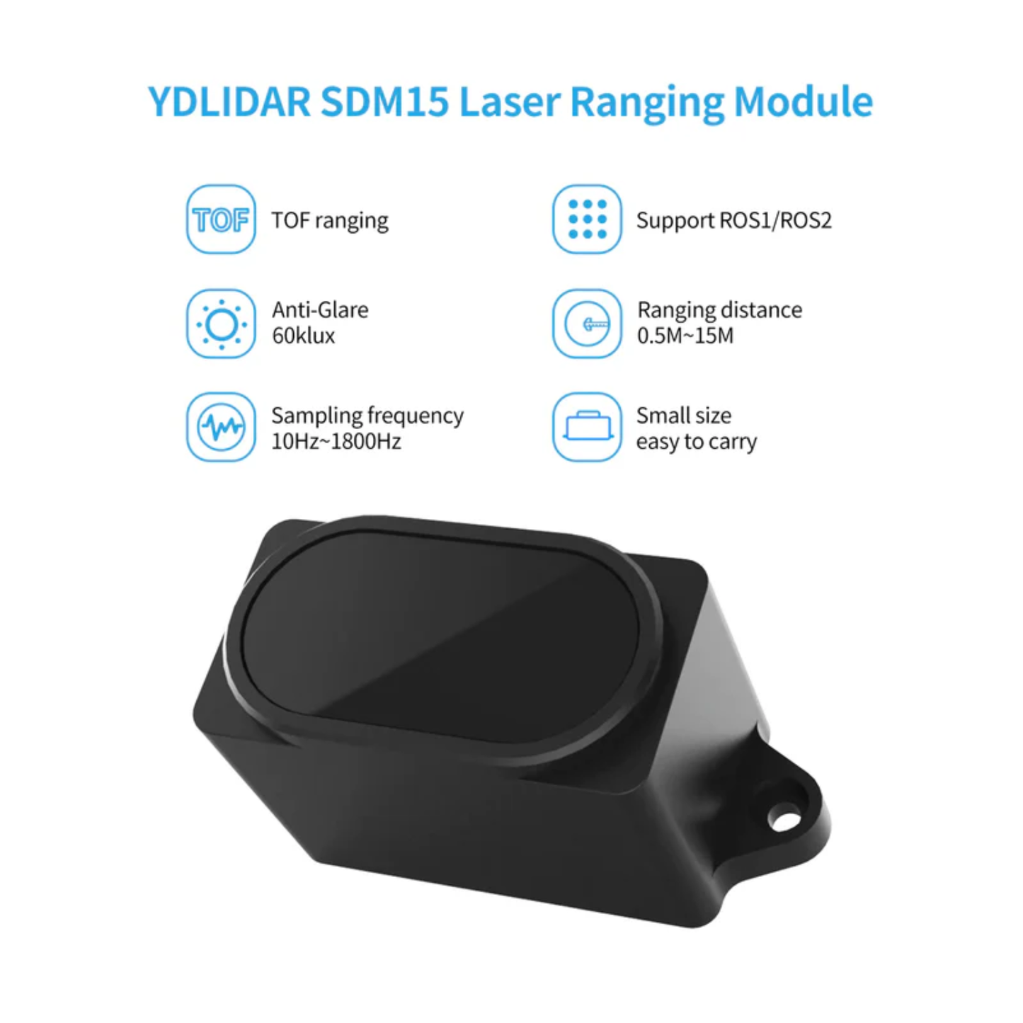 The YDLIDAR SDM15 Outdoor Laser Sensor, a meticulously engineered high-precision laser ranging module. Boasting an exceptionally low margin of error and unwavering stability, this sensor provides dependable distance measurements you can trust. Leveraging the advanced Time of Flight (TOF) principle, the SDM15 captures data at an impressive rate of up to 1.8 kHz, allowing for swift and responsive environmental perception.